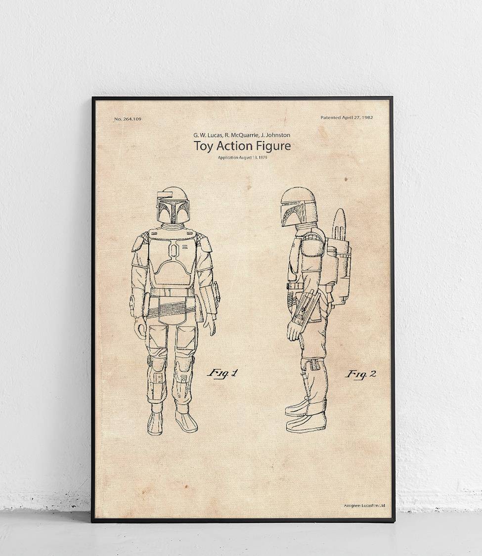 A patent poster featuring one of the most iconic bounty hunters from the Star Wars universe, created by George W. Lucas Jr., Ralph McQuarrie, and Joe Johnston.