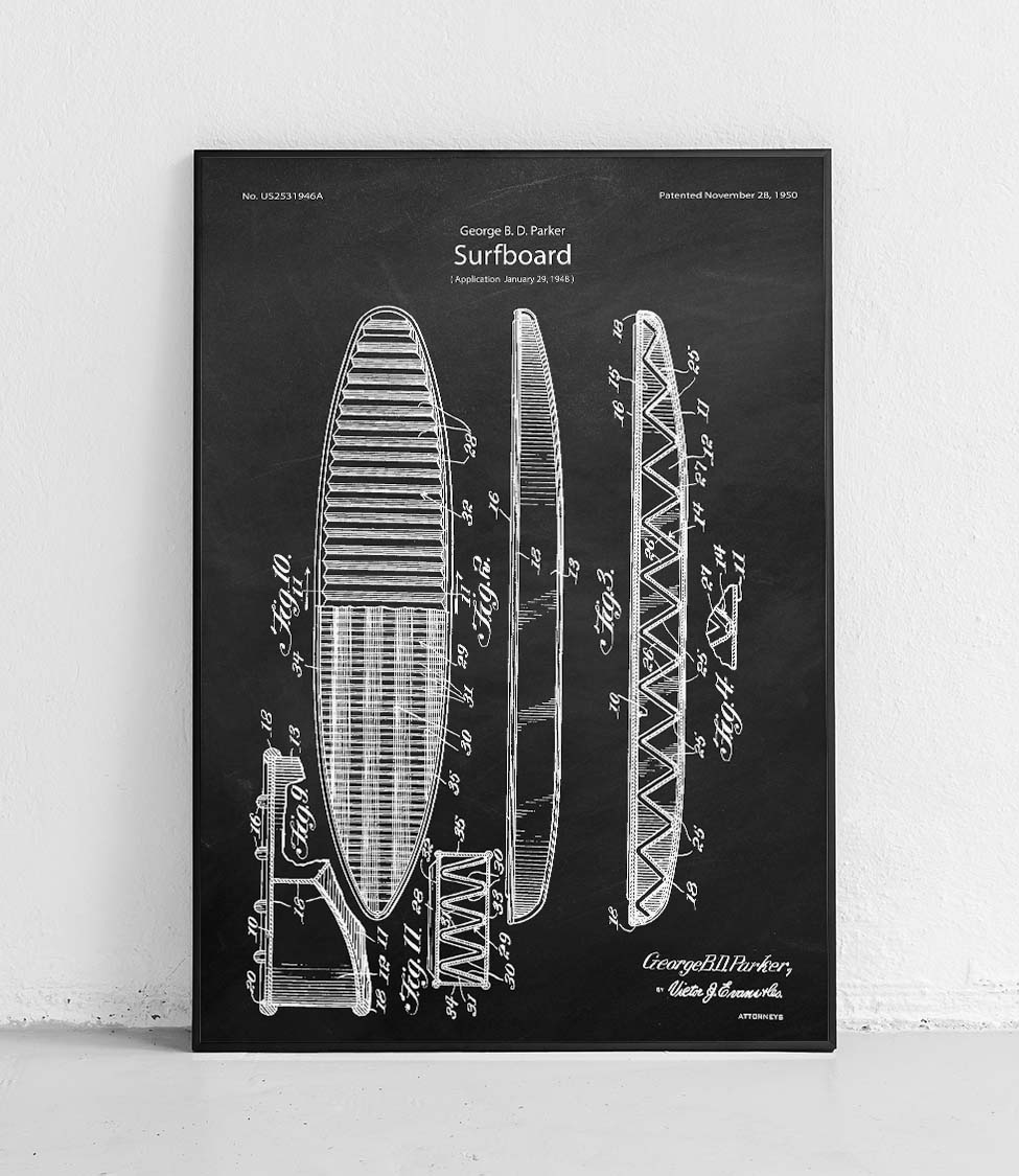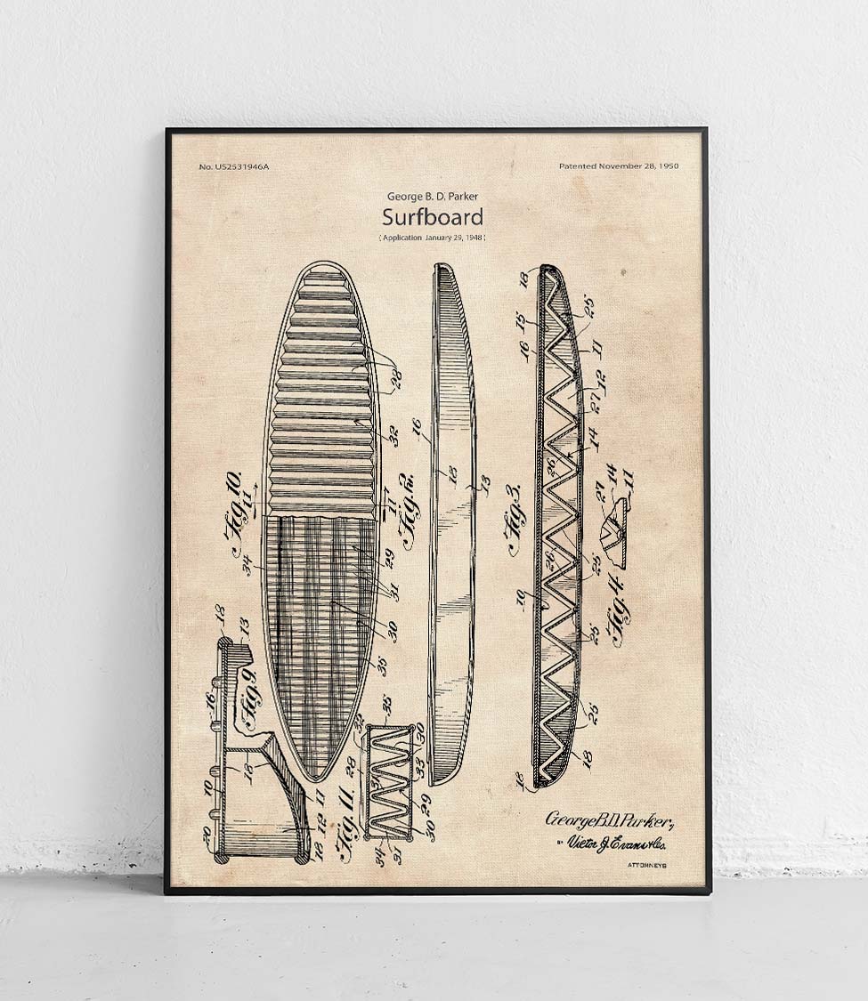 A poster featuring a reproduction of George Parker's surfboard patent.