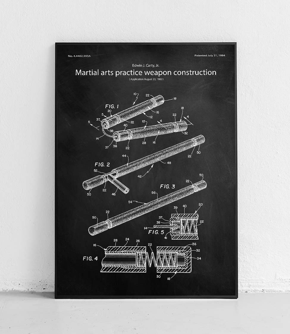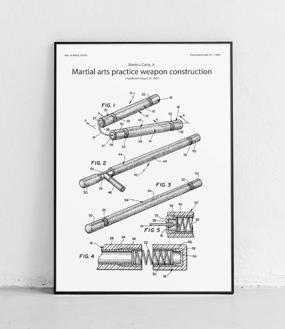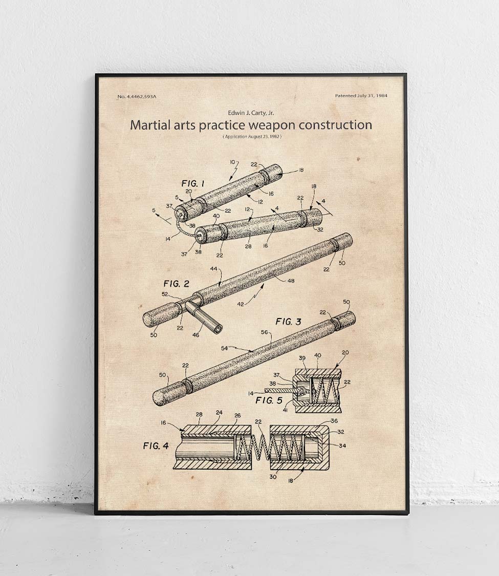 A poster featuring a patent reproduction of a training weapon design by Edwin J. Carty, Jr.