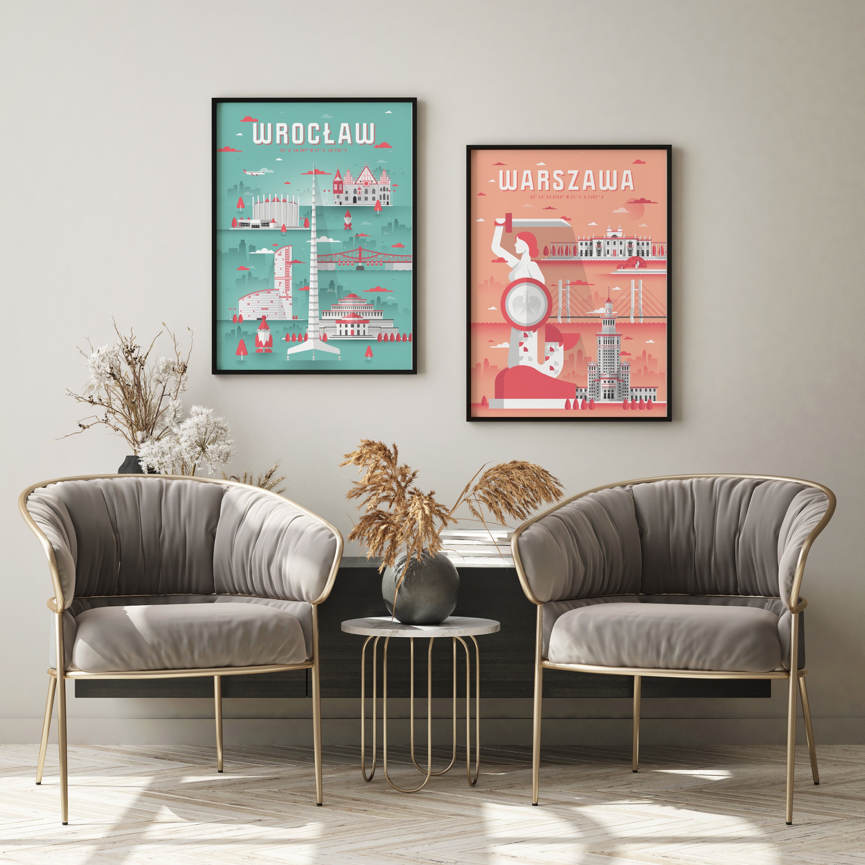 Zestaw plakatów Warszawa różowa i Wrocław seledynowy