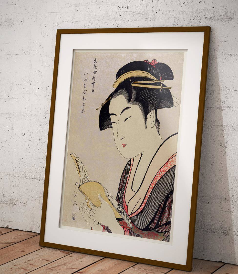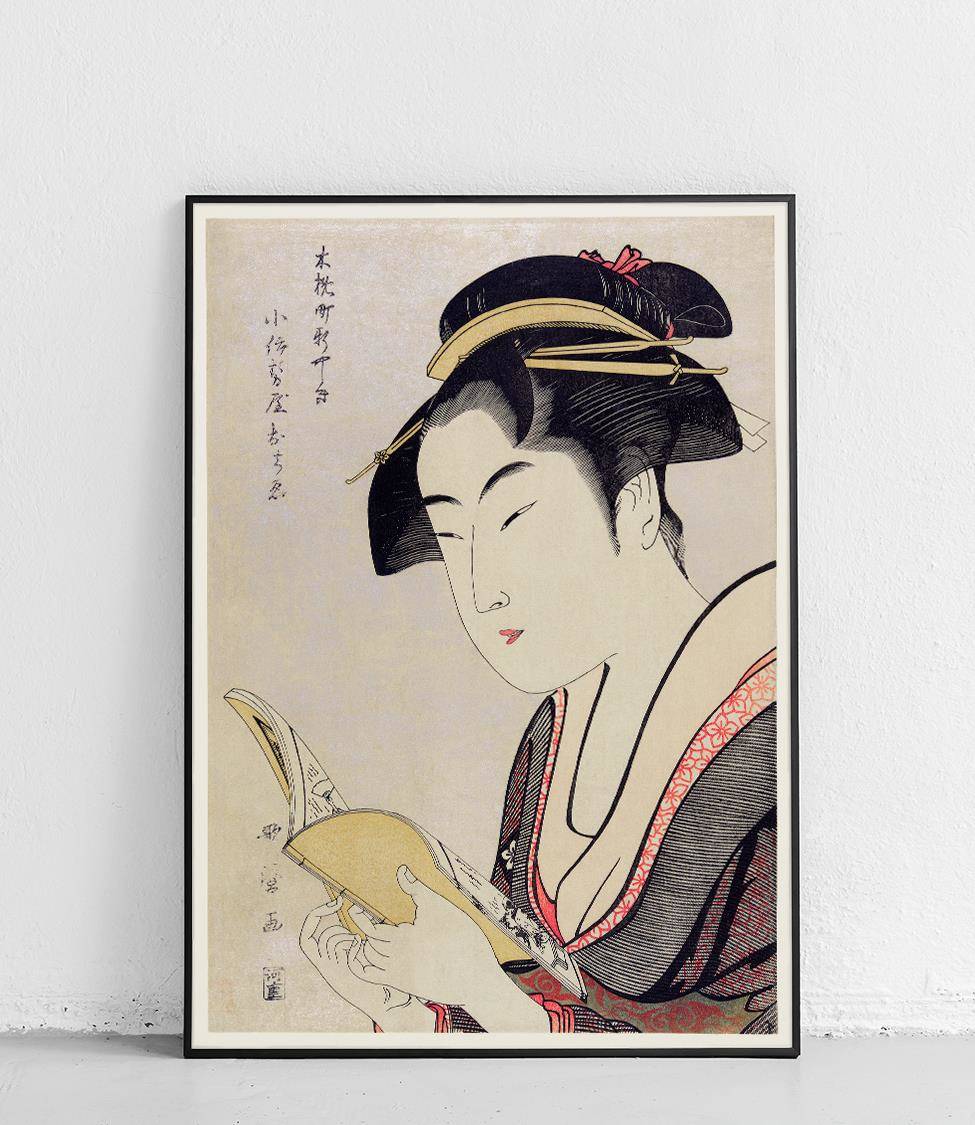 Portrait d'une femme lisant sur une affiche sur le thème du Japon.
