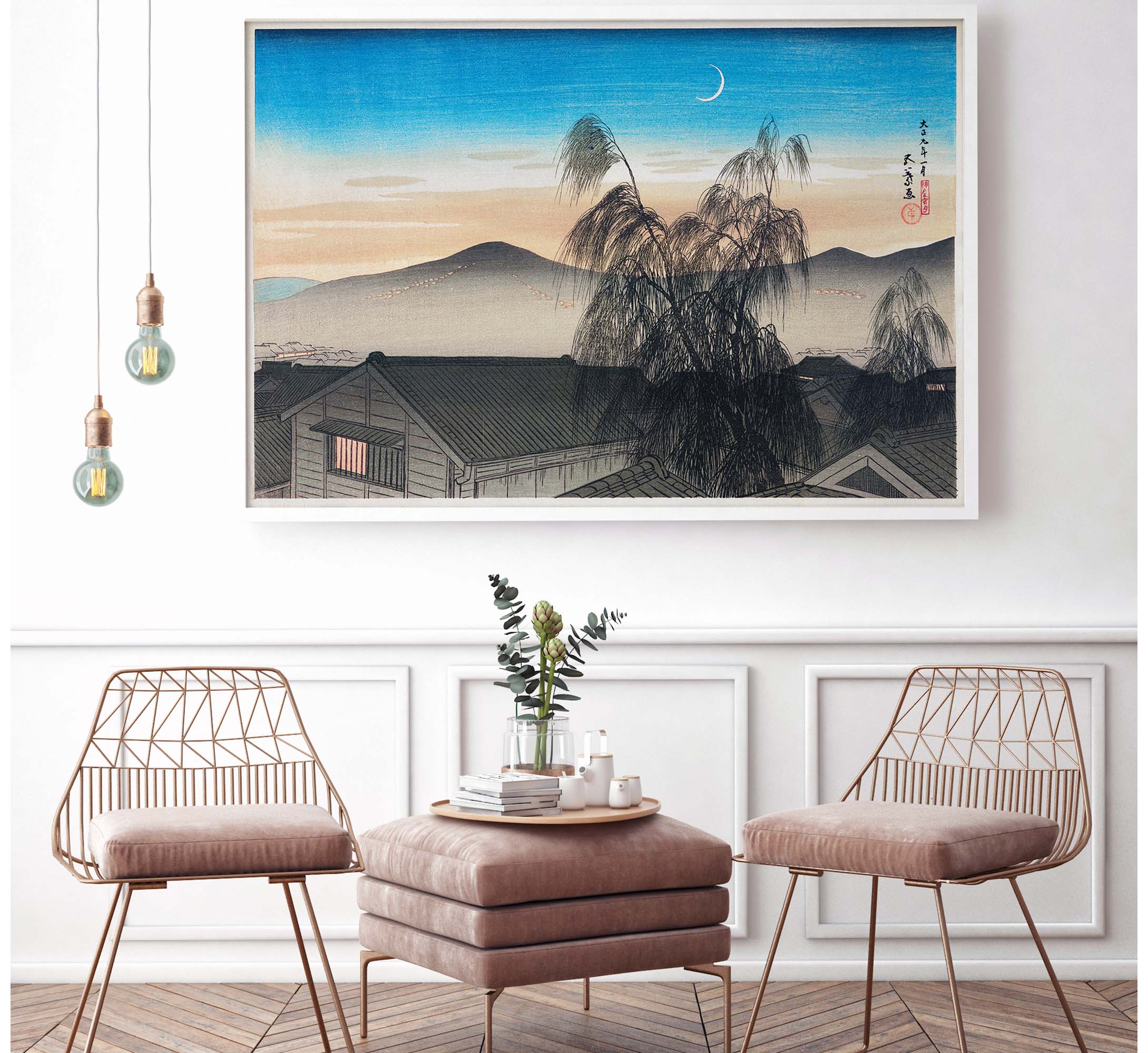 Lune sur Kobe - une belle affiche montrant le ciel nocturne au-dessus de la ville japonaise. Parfait pour les amoureux des paysages et de la culture japonaise.