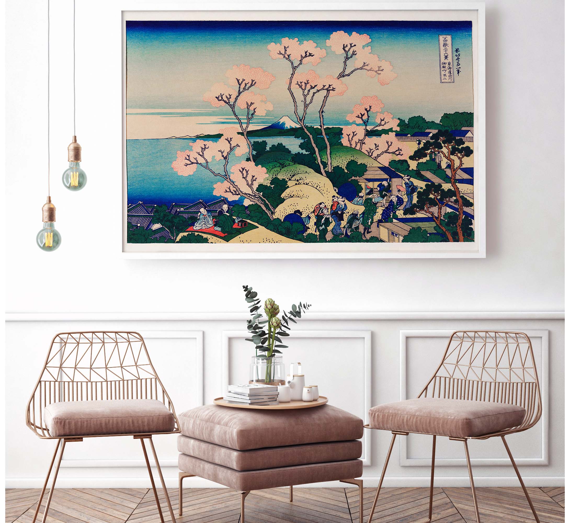 Affiche montrant un pique-nique de villageois sur la colline de Goten-yama au Japon. Idéal pour les amoureux des paysages et de la culture du pays du soleil levant.