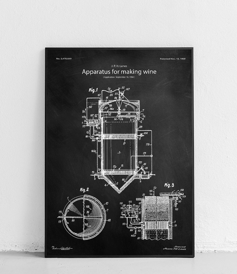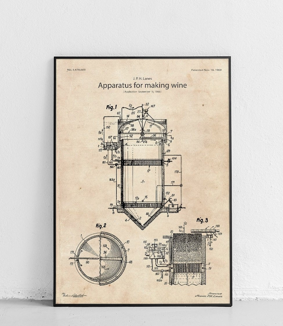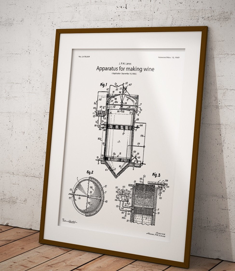 Affiche montrant un appareil de vinification. Parfait pour les amateurs de vin et les collectionneurs de brevets.