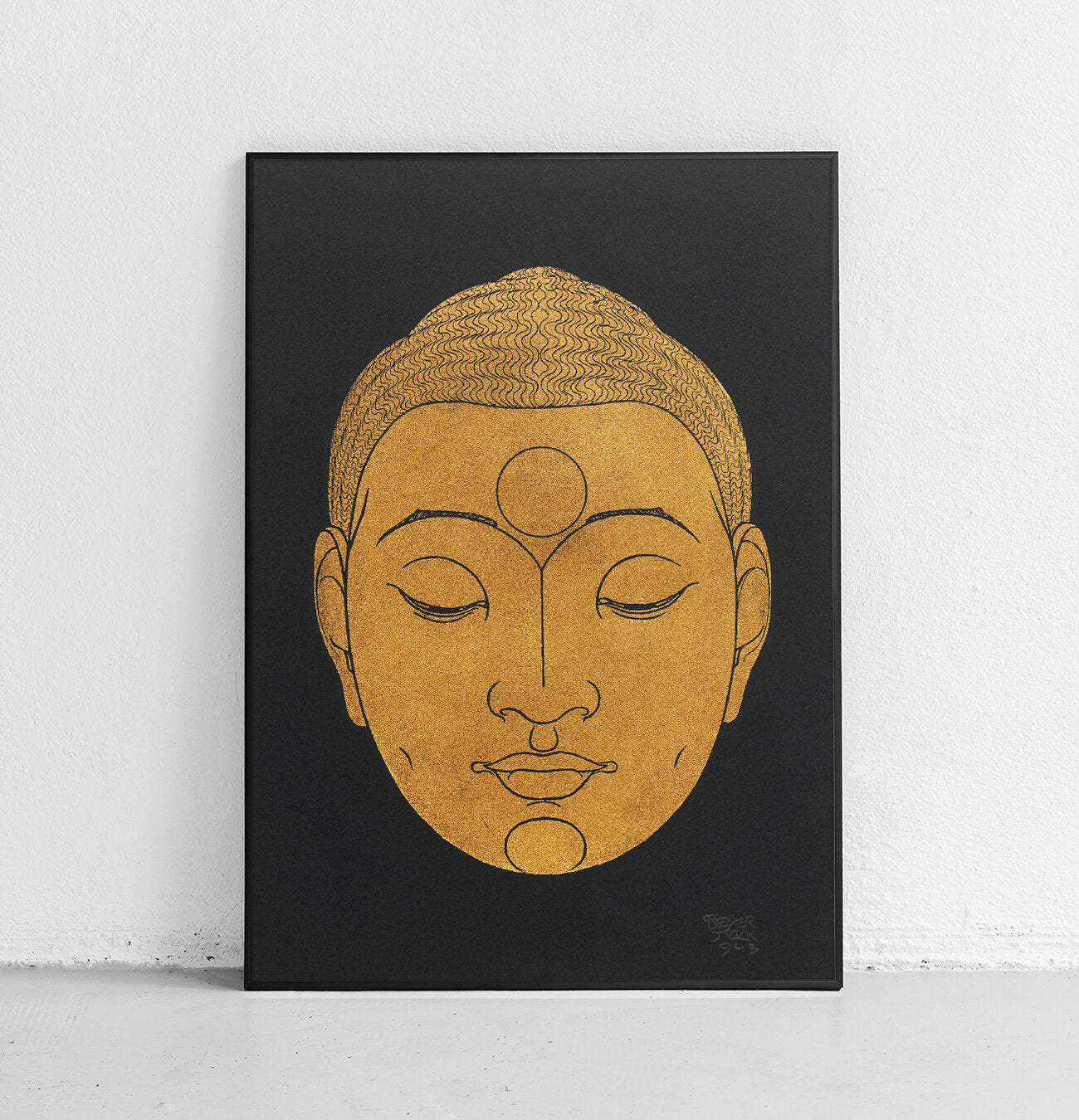 Une affiche avec une reproduction d'une illustration montrant la tête de Bouddha. L'illustration a été créée par Reijer Johan Antonie Stolk (1896–1945), un artiste néerlandais.