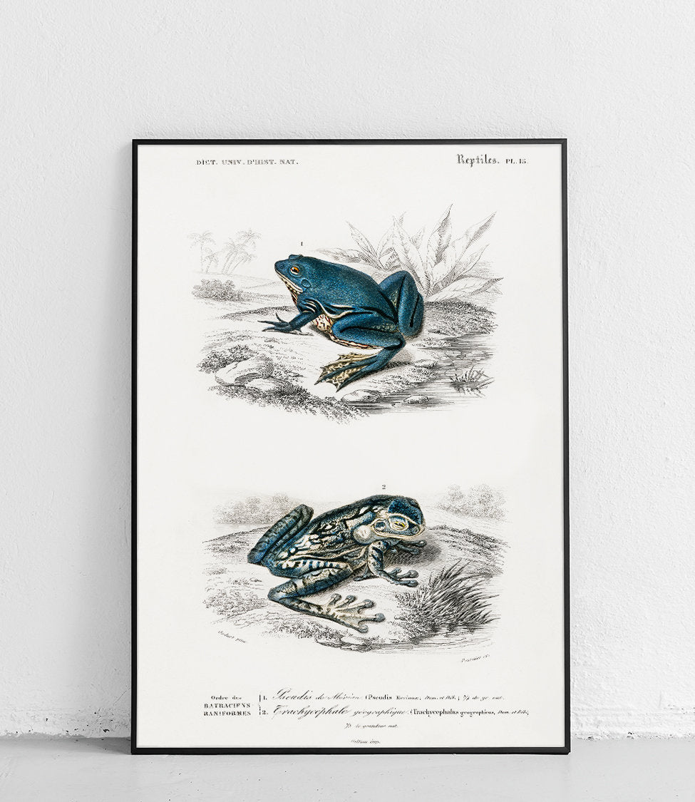 Affiche d'une chauve-souris à pieds rouges et d'une grenouille arlequin. Parfait pour les amoureux des animaux et de la nature.
