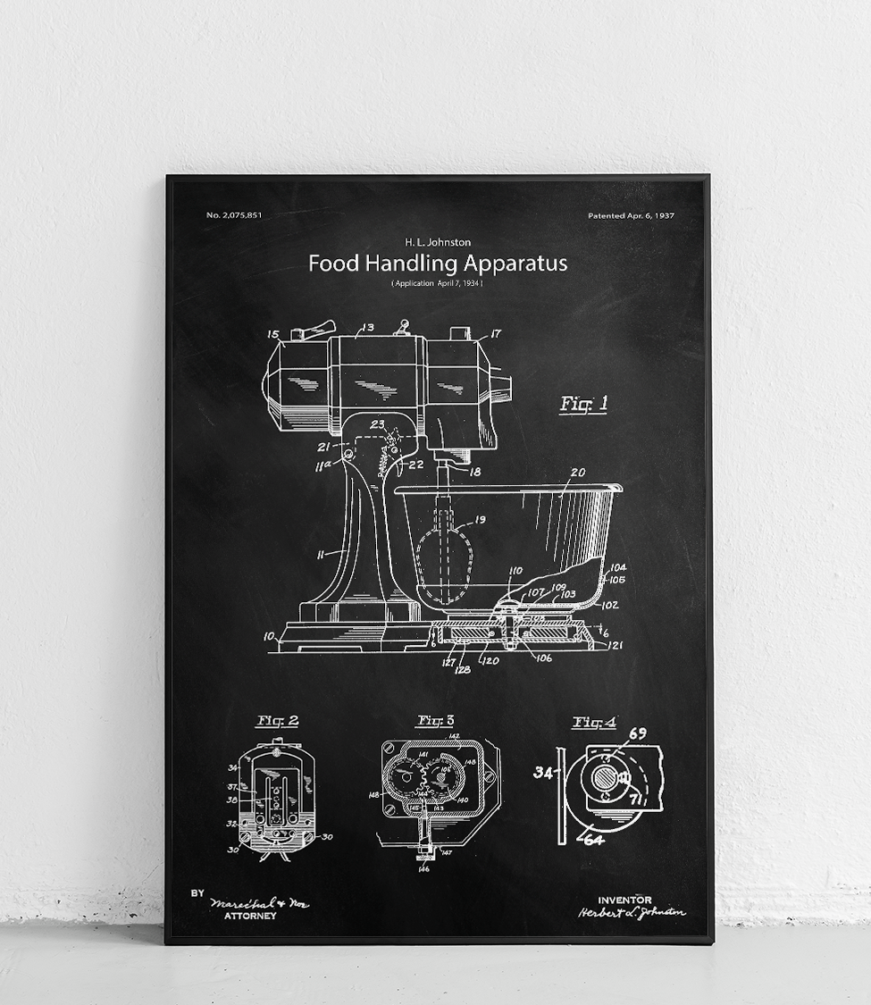 Une affiche reproduisant un brevet pour un robot culinaire par Herbert L. Johnston.