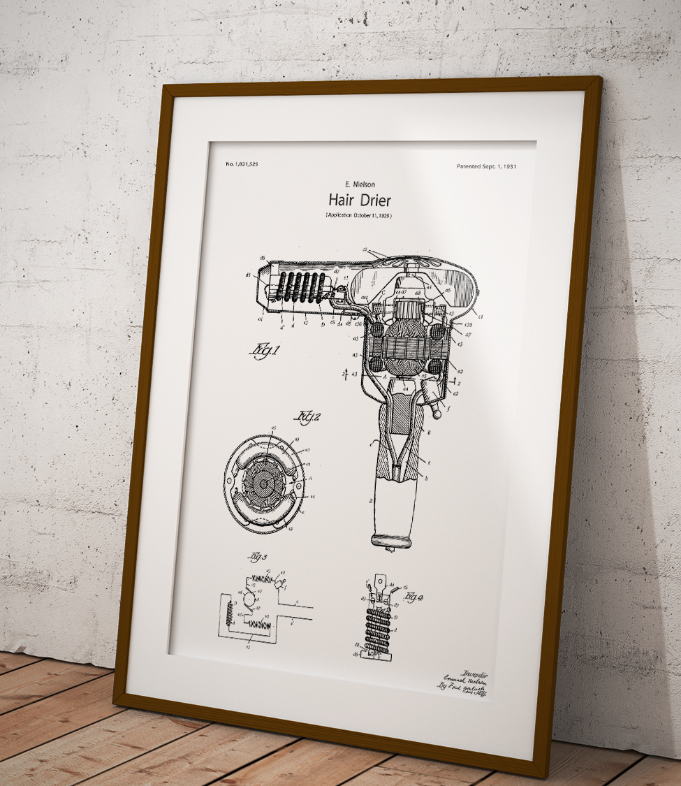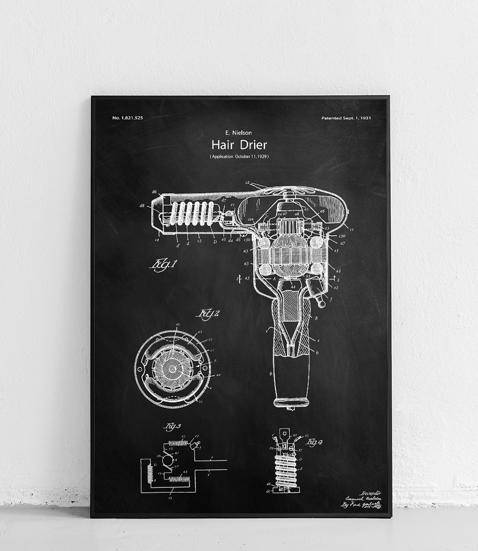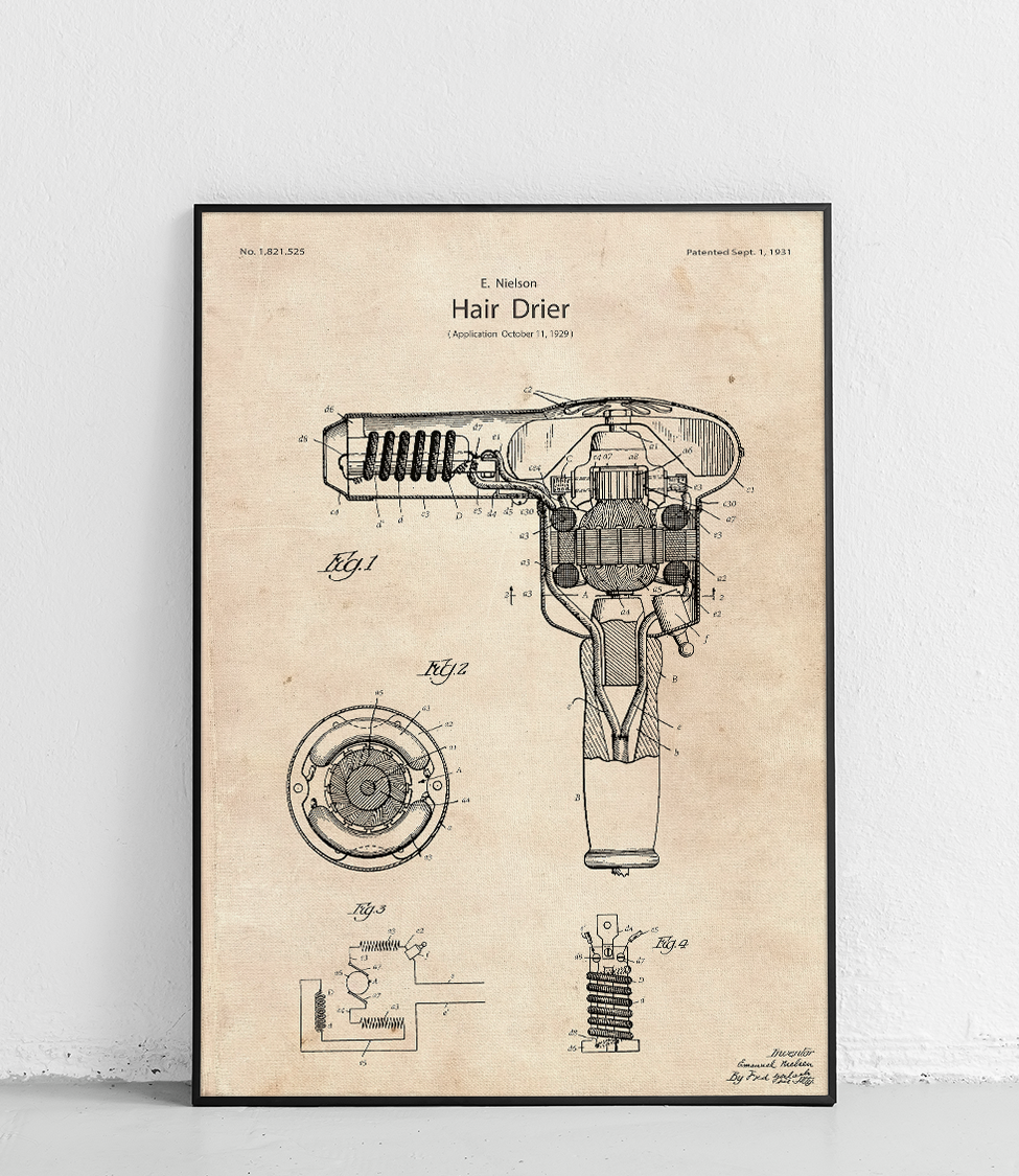 Affiche montrant un sèche-cheveux dans un style minimaliste. Parfait pour les amateurs de design moderne et de brevets de coiffure.