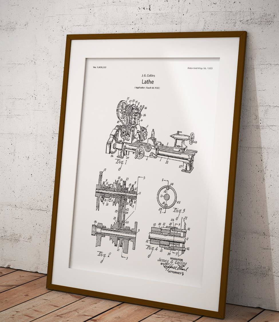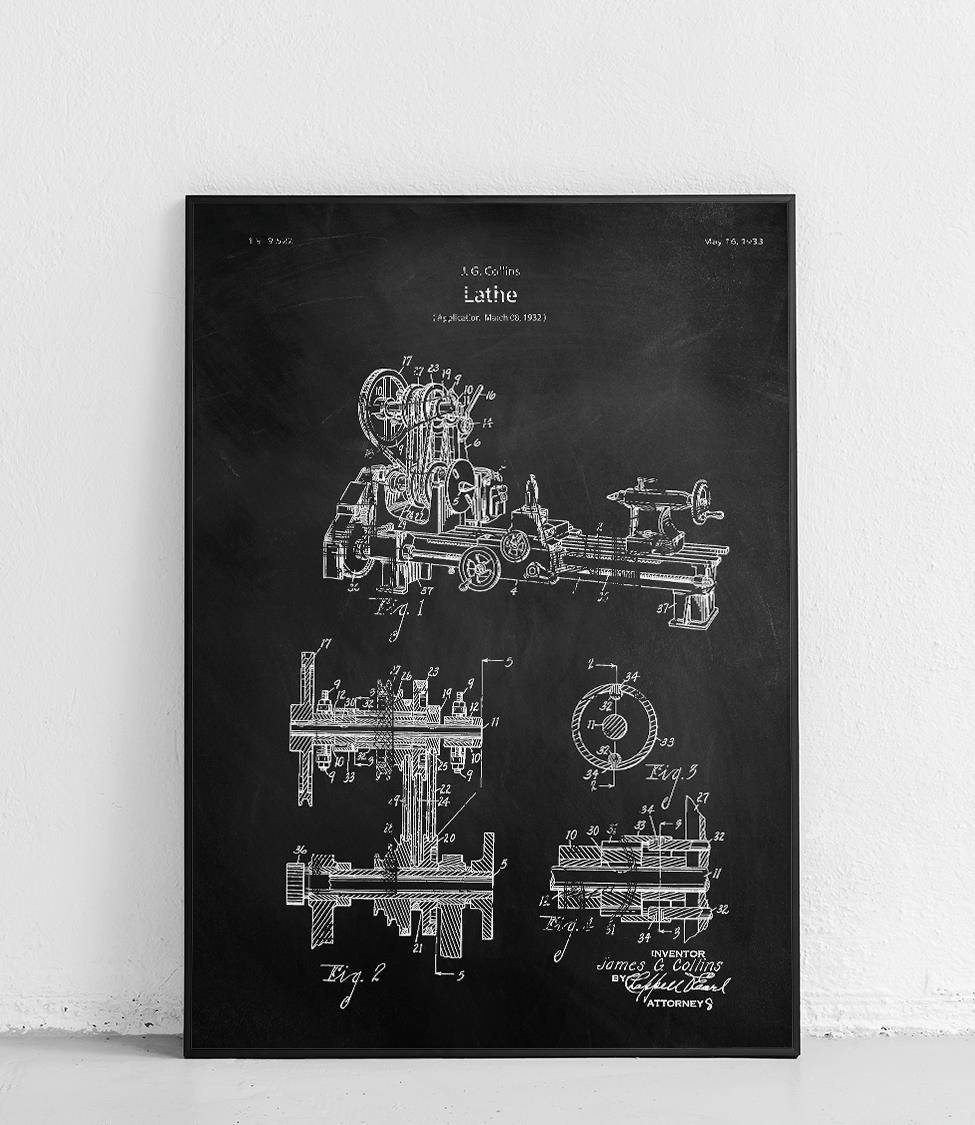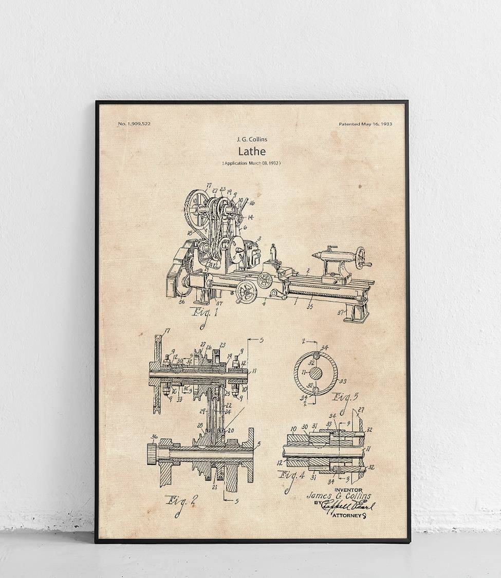 Plakat z reprodukcją patentu przedstawiającego tokarkę autorstwa James'a G. Collins.