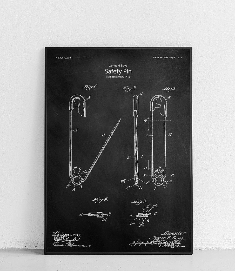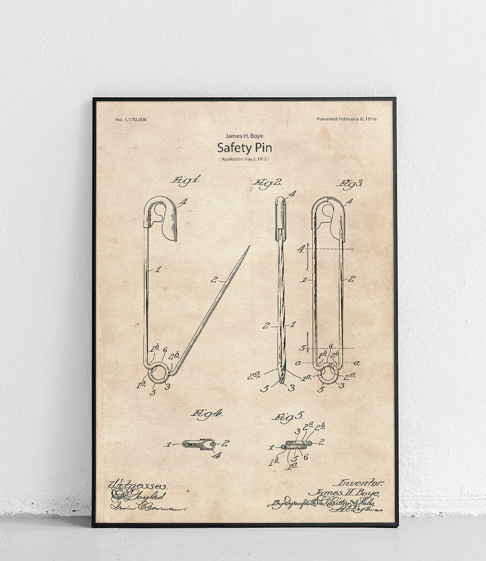 Plakat z reprodukcją patentu agrafki autorstwa James'a H. Boye.