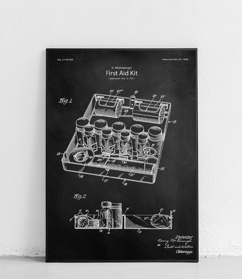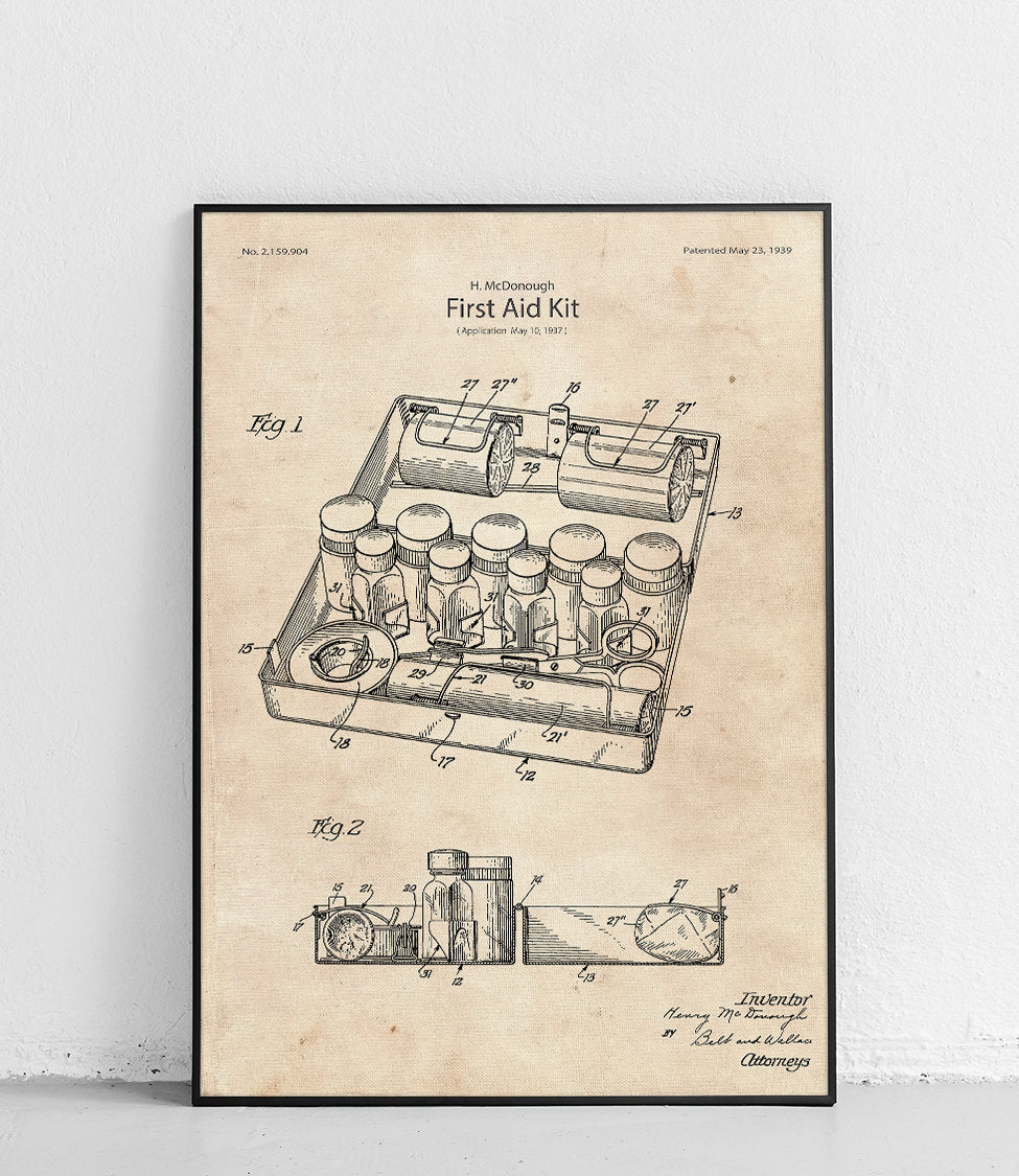 Plakat z reprodukcją patentu przedstawiającego apteczkę pierwszej pomocy, autorstwa Henry'go Mcdonough.