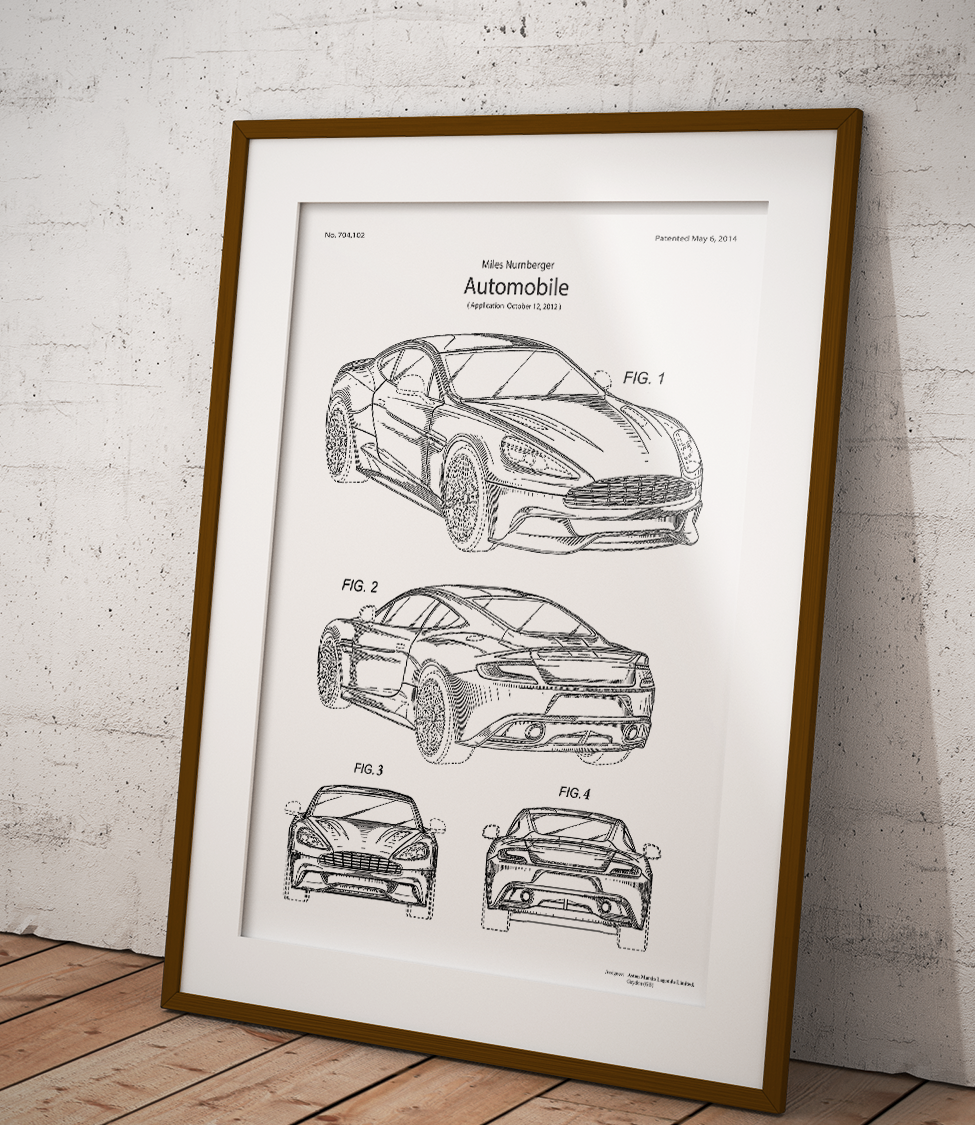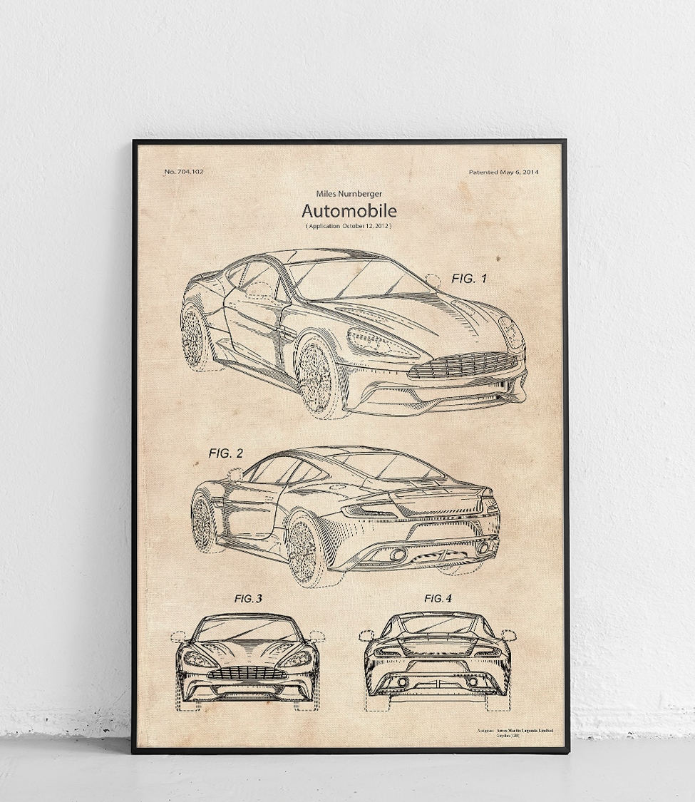 Plakat z reprodukcją patentu Aston Martin Vanquish autorstwa Miles'a Nurnberger.