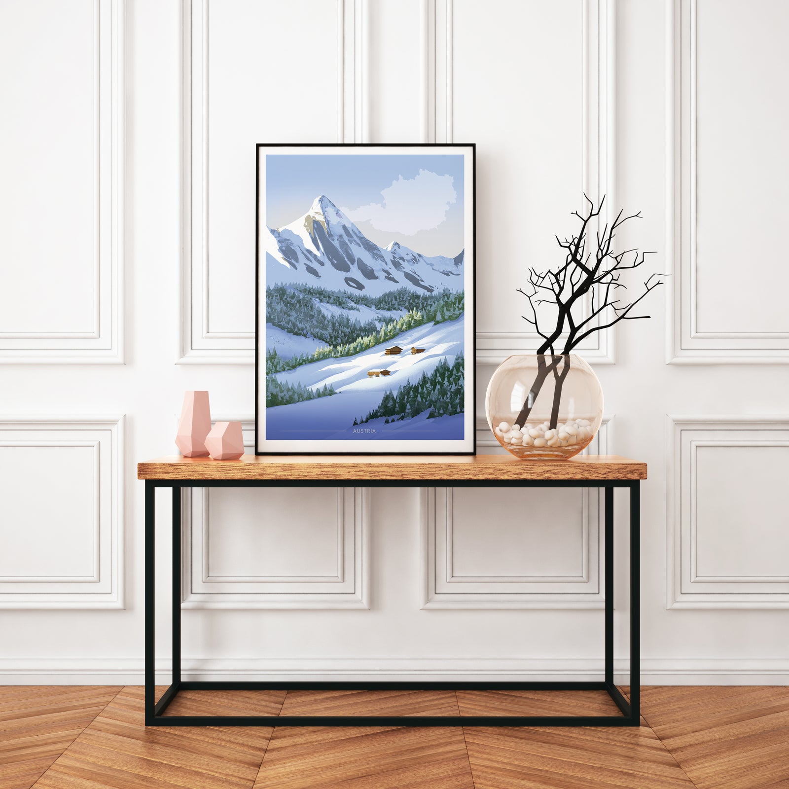 Ten plakat przedstawia region szczególny, Austrię. Plakat przedstawia malowniczo położoną wioskę Alpbach, w sercu Tyrolu z charakterystyczną zabudową - drewniane domki o szeroko spadzistych dachach i pięknych rzeźbionych w drewnie balkonach.