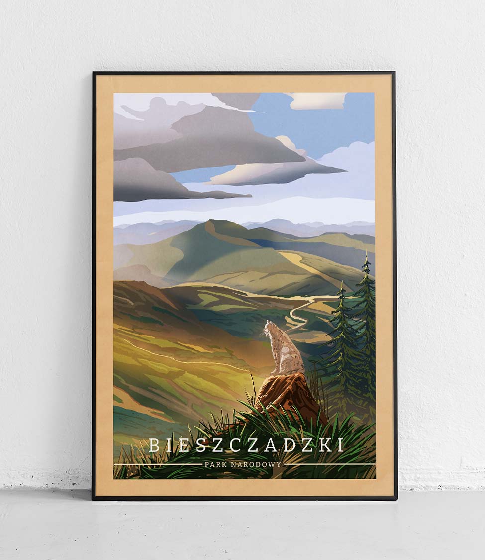 położony w Bieszczadach Zachodnich. Utworzony w 1973 roku. W 1992 roku stał się częścią Międzynarodowego Rezerwatu Biosfery „Karpaty Wschodnie”. Od 2021 roku 11% powierzchni parku wpisane jest na listę światowego dziedzictwa UNESCO. Jest trzecim co do wielkości parkiem narodowym na terenie Polski i największym parkiem narodowym w polskich górach. Bieszczadzki Park Narodowy zajmuje południowo-wschodnią część województwa podkarpackiego. Na jego obszarze leży także najbardziej na południe wysunięty punkt Polski, położony przy granicy z Ukrainą, szczyt Opołonek (1028 m n.p.m.). Siedziba Dyrekcji Parku mieści się w Ustrzykach Górnych. Gatunkiem „herbowym” Bieszczadzkiego Parku Narodowego jest ryś. Powierzchnia Bieszczadzkiego Parku Narodowego wynosi obecnie 292,02 km². Jego otulinę stanowią Ciśniańsko-Wetliński Park Krajobrazowy i Park Krajobrazowy Doliny Sanu.Bieszczadzki Park Narodowy plakat to dzieło Macieja Ptasińskiego. Jedyny w swoim rodzaju plakat polskiej turystyki, wykonany specjalnie na nasze zamówienie.