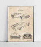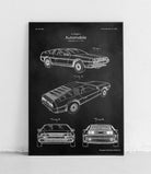 Plakat z reprodukcją patentu przedstawiającego jedyny samochodód wytwarzany przez DeLorean Motor Company tj. DeLorean DMC-12, autorstwa Giorgetto Giugiaro. Rozgłos uzyskał dzięki trylogii filmowej „Powrót do przyszłości” jako wehikuł czasu.