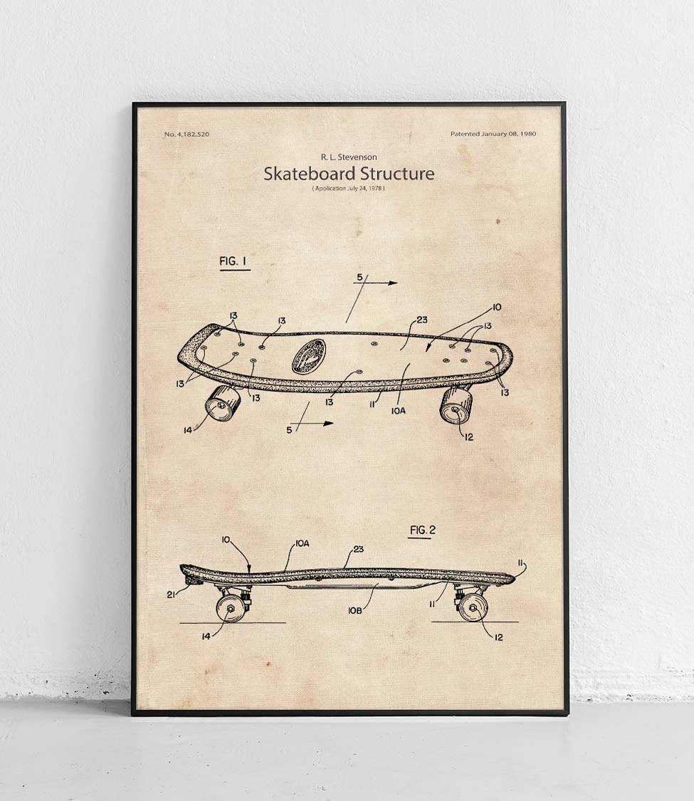 Plakat z reprodukcją patentu przedstawiającego deskorolkę, autorstwa Richard'a L. Stevenson.