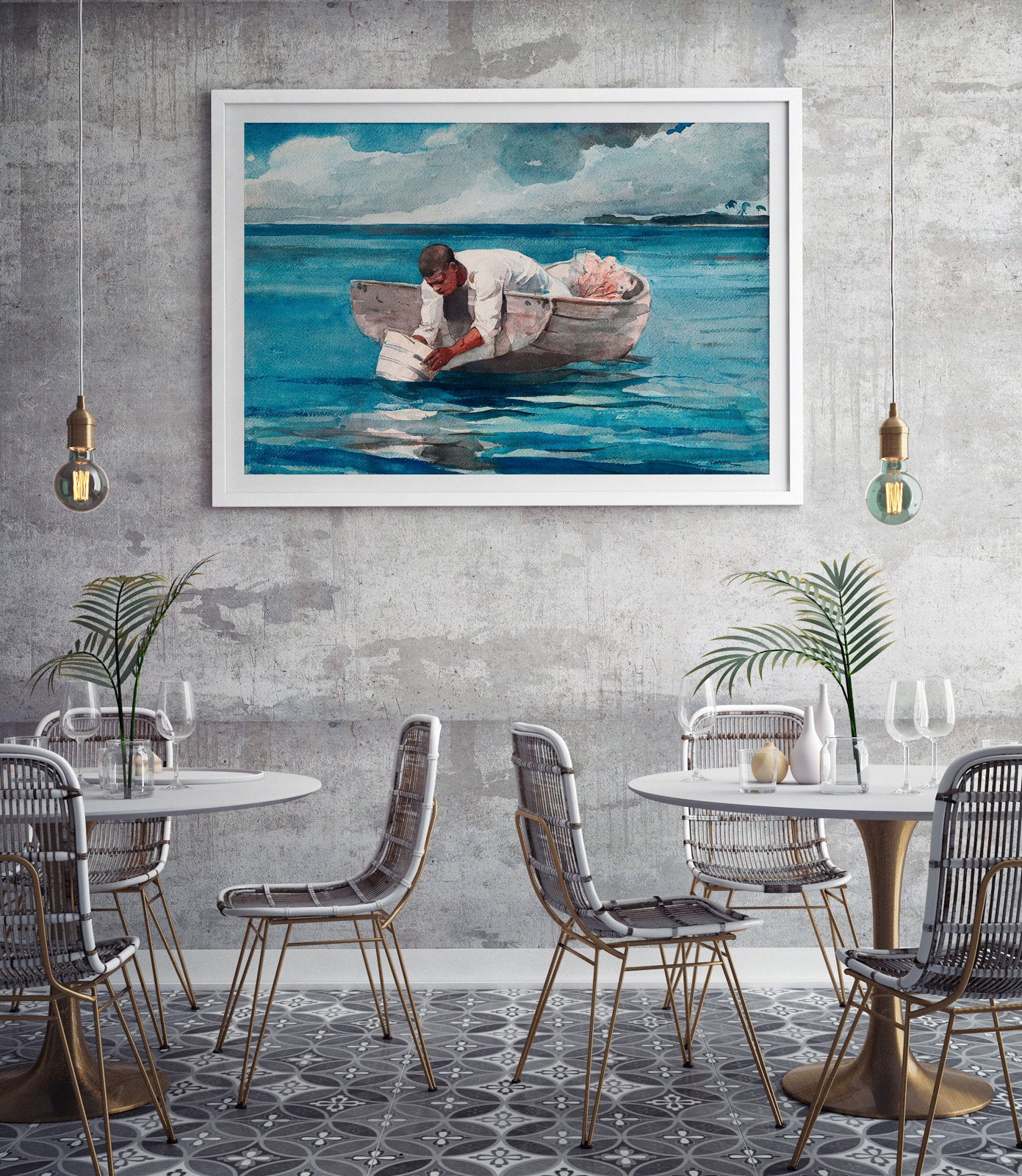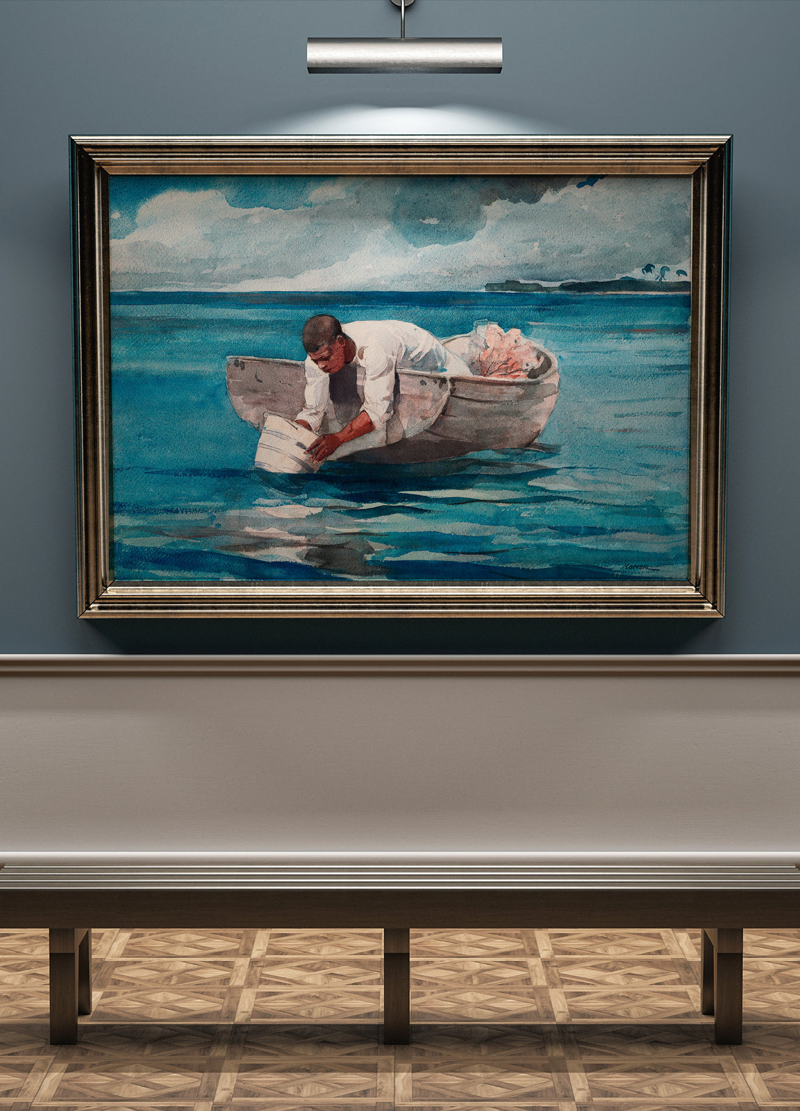 malarz, grafik i ilustrator. Jeden z najwybitniejszych artystów działających w drugiej połowie XIX w. w Stanach Zjednoczonych. Członek National Academy of Design od roku 1865.Załączona grafika przedstawia "Dmuchawa wodna" namalowany w 1898/99 . Grafika przedstawia młodego czarnoskórego mężczyznę intensywnie poszukującego koralowców za pomocą wiadra ze szklanym dnem. Urządzenie to, określane jako "szkło wodne" lub "szkło gąbkowe", służyło do stabilizowania powierzchni poruszającej się wody w celu poprawy widoczności. Homera mógł przyciągnąć ten temat, ponieważ zwraca uwagę na stale poruszającą się powierzchnię wody, a także jej przejrzystość - aspekty morza, które szczególnie intrygowały go na Bahamach. Podobnie jak Nurek z gąbki (1898/99; MFA Boston), praca ta miała pierwotnie bardziej widoczne czerwone rozmycia w wodzie, sugerujące różowy koral pod powierzchnią. Choć obszary te wyblakły, płynne pociągnięcia ciemniejszego błękitu nad warstwami przejrzystego turkusu skutecznie sugerują grę światła, zarówno bezpośredniego, jak i odbitego, nad wodą.