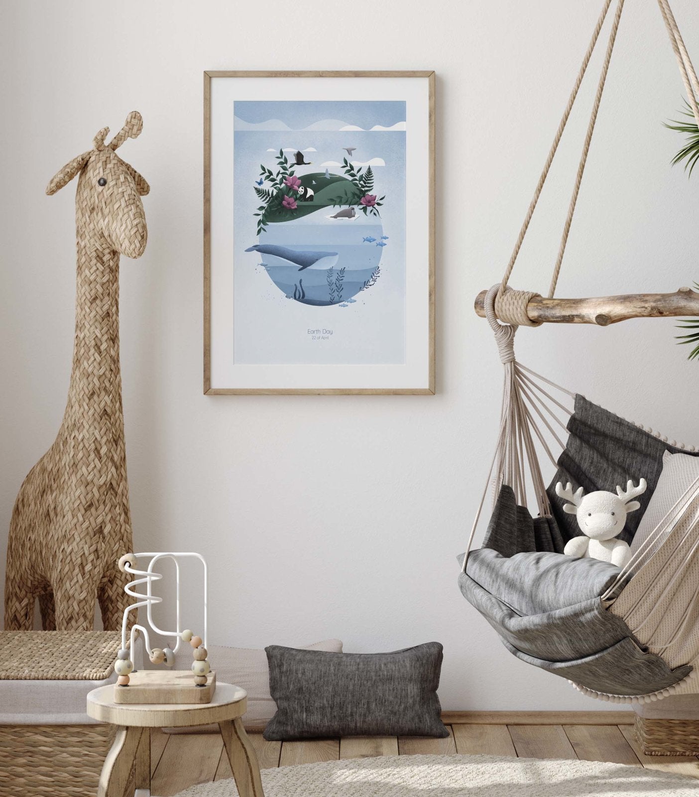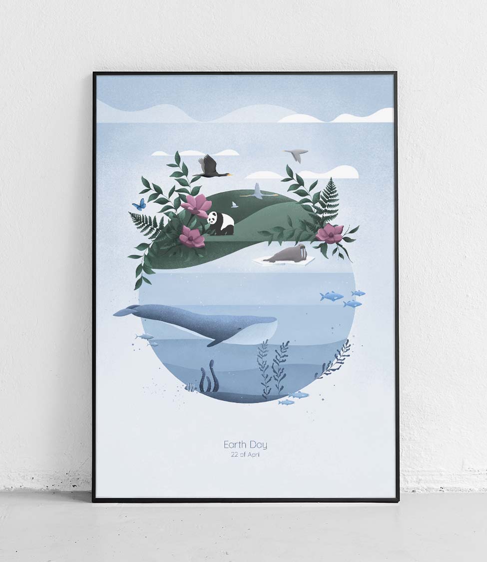 Dzień Ziemi plakat z serii “Plakaty Ekologiczne”. Plakat na dzień ziemi z tej serii przedstawia konsekwencje działania człowieka na wszystkie cztery żywioły - ogień, woda, ziemia i powietrze. Seria ma za celu promowanie idei dbałości o środowisko naturalne i aktywną edukację ekologiczną poprzez podniesienie świadomości w zakresie zrównoważonej konsumpcji, świadomych zakupów, kształtowanie postaw związanych z dbałością o środowisko naturalne i rozwijanie wrażliwości na tematy związane z szeroko pojętą ekologią. Plakat dzień ziemi jest dodatkiem do całej serii i oddaje hołd naszej planecie Ziemi. Plakat z okazji dnia ziemi pokazuje zagrożone gatunki jak niedźwiedź polarny, tuńczyka błękitnopłetwego, morsa i pandę wielką.