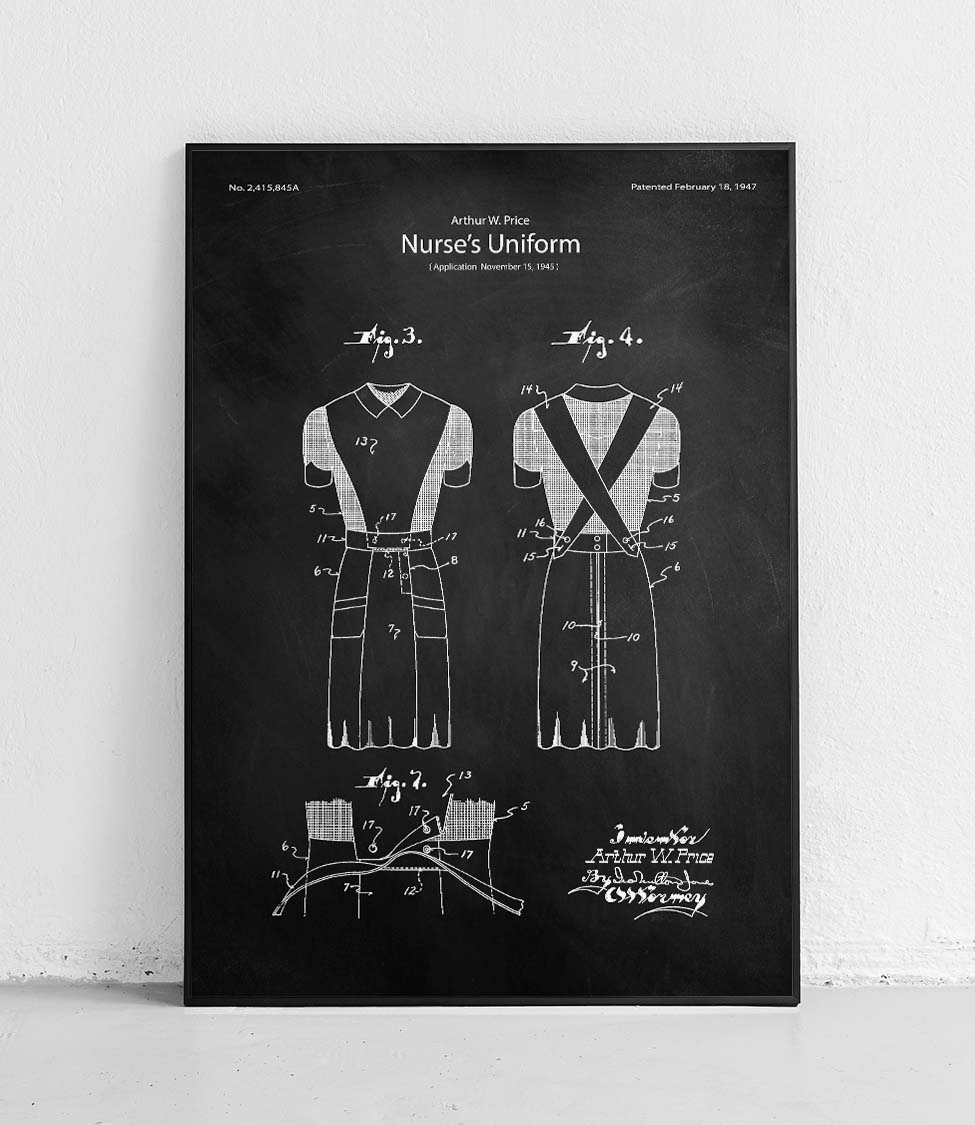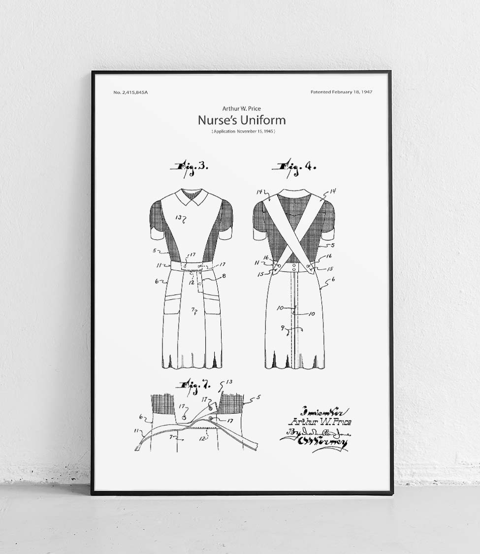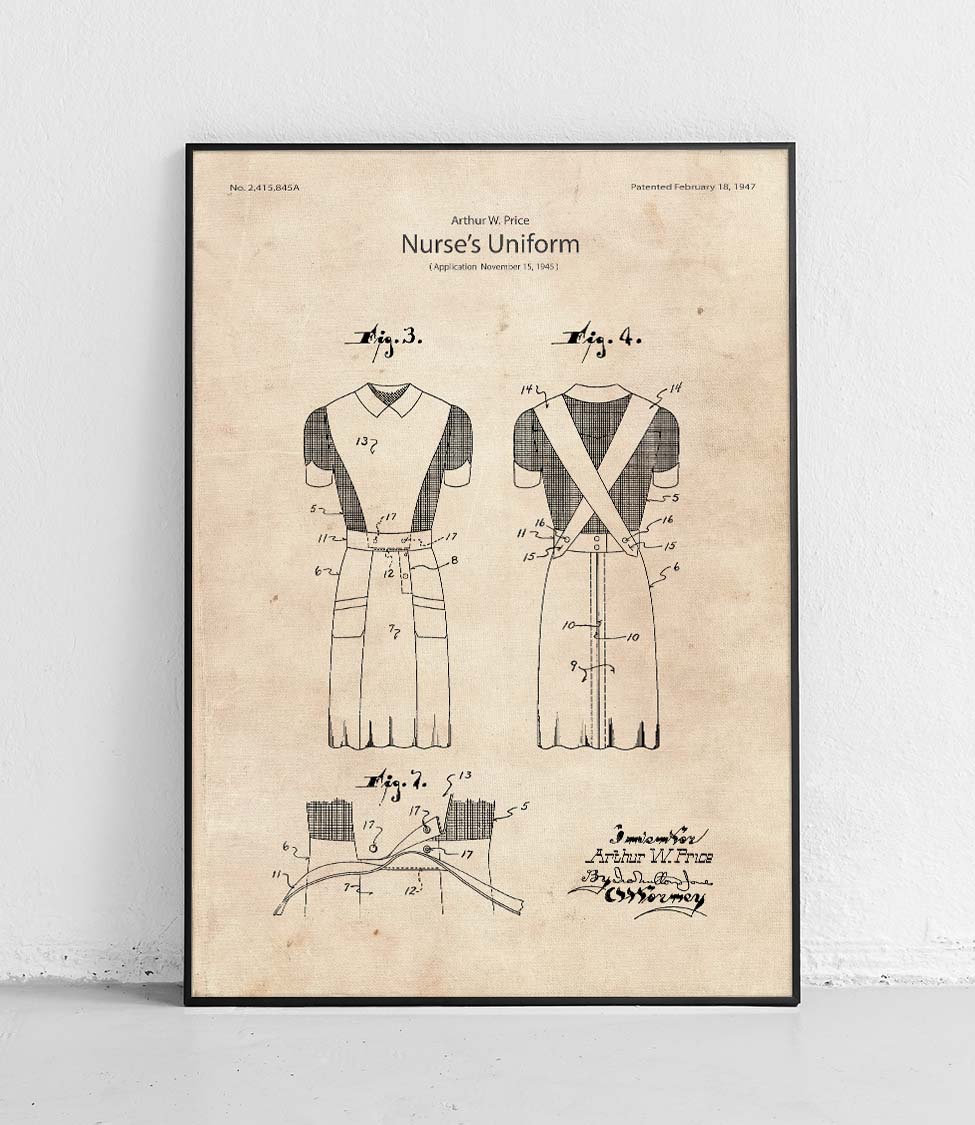 Plakat z reprodukcją patentu przedstawiającego fartuch pielęgniarski, autorstwa Arthur W Price.