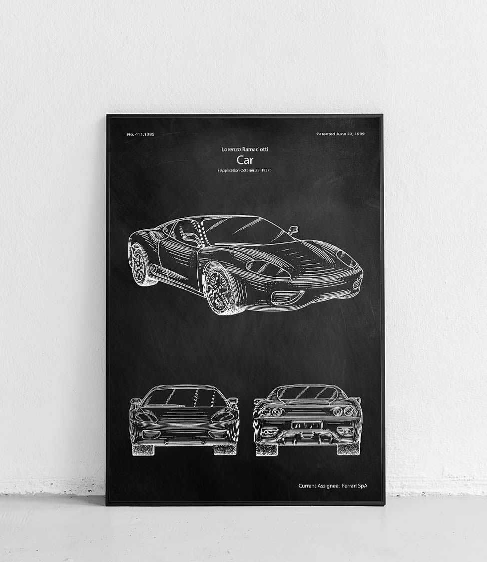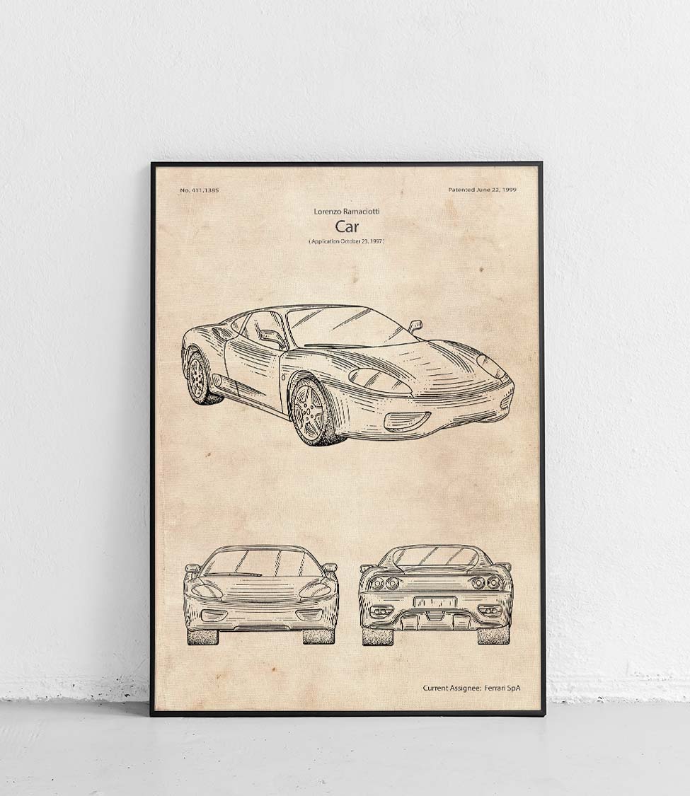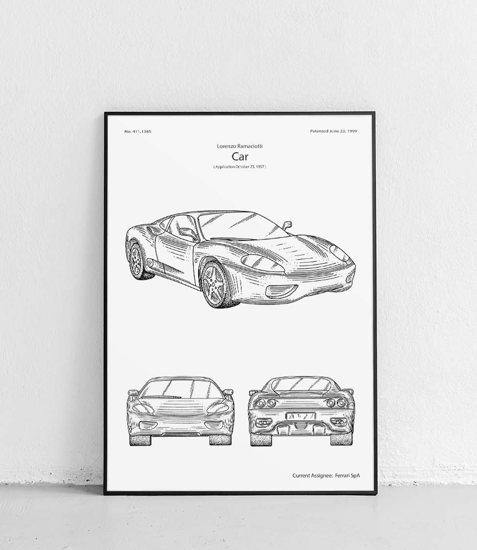 Plakat z reprodukcją patentu przedstawiającego prototyp Ferrari 360 Modena, autorstwa Lorenzo Ramaciotti.