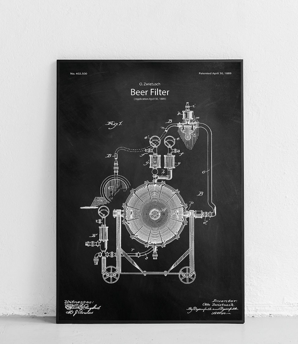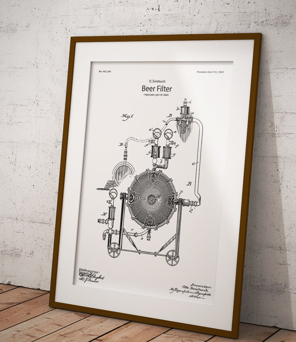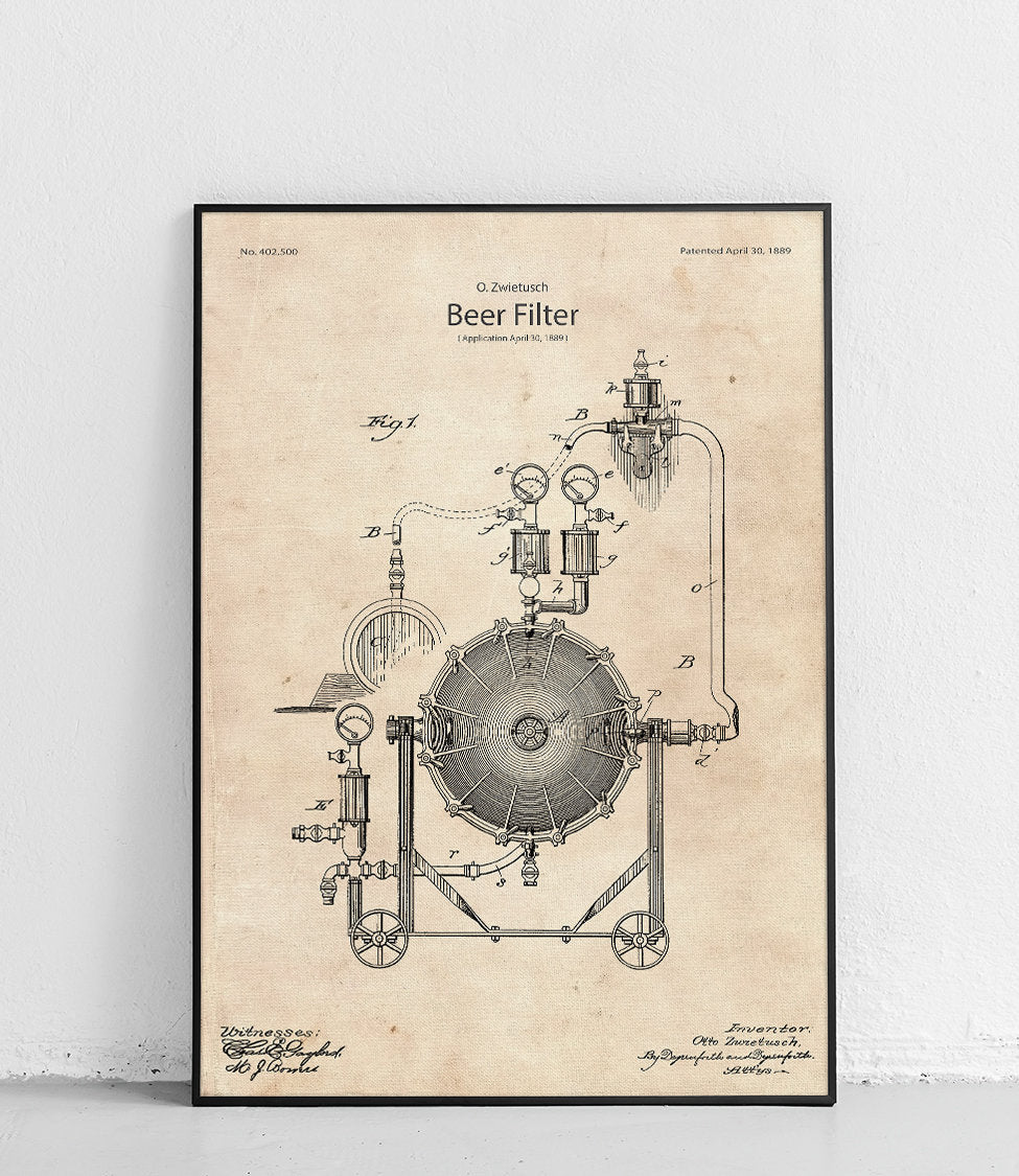 Plakat z reprodukcją patentu przedstawiającego filtr do piwa, autorstwa Otto Zwietusch.