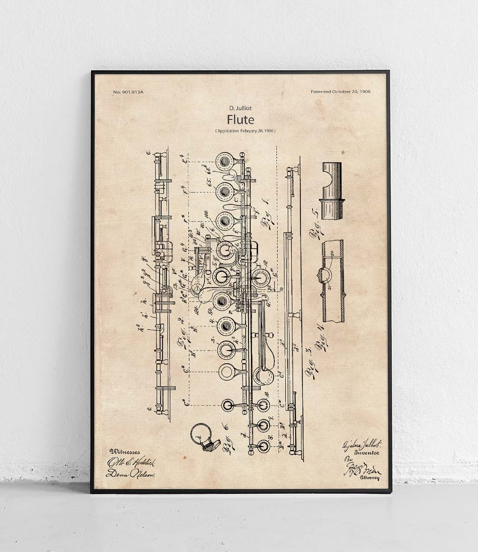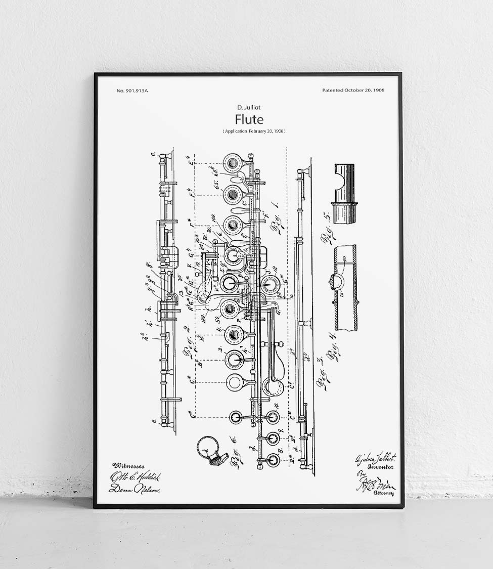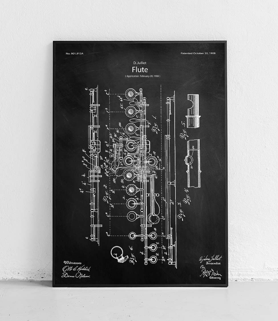 Plakat z reprodukcją patentu fletu autorstwa Djalma Julliot.