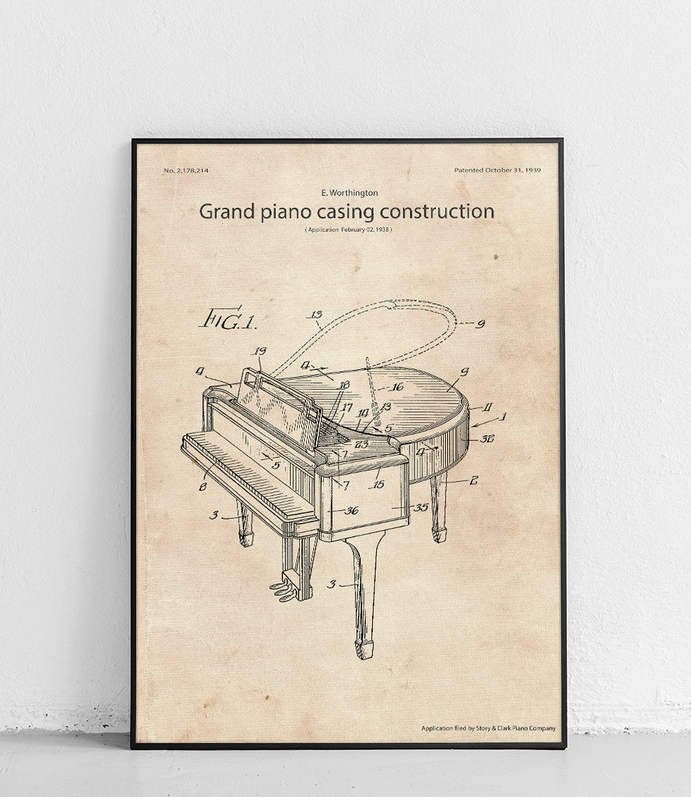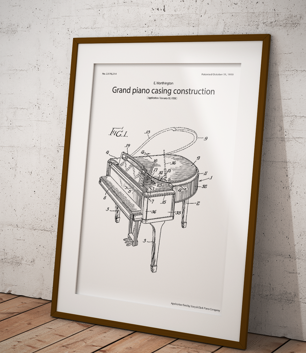 Plakat z reprodukcją patentu przedstawiającego fortepian, a dokładnie konstrukcję jego obudowy autorstwa Everett Worthington.