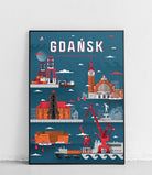 Plakat przedstawia największe symbole Gdańska, w tym: Dworzec Główny, Żuraw, Fontanna Neptuna, ECS, terminal kontenerowy.