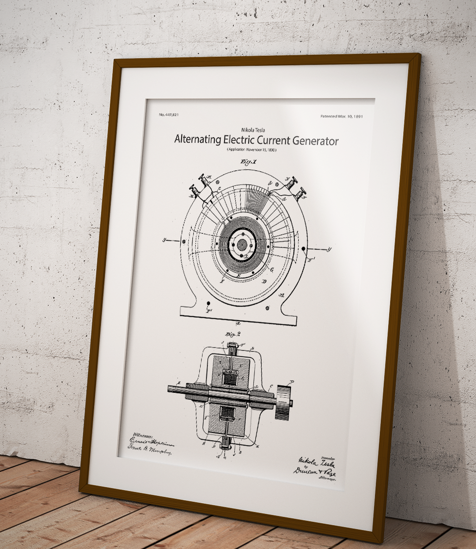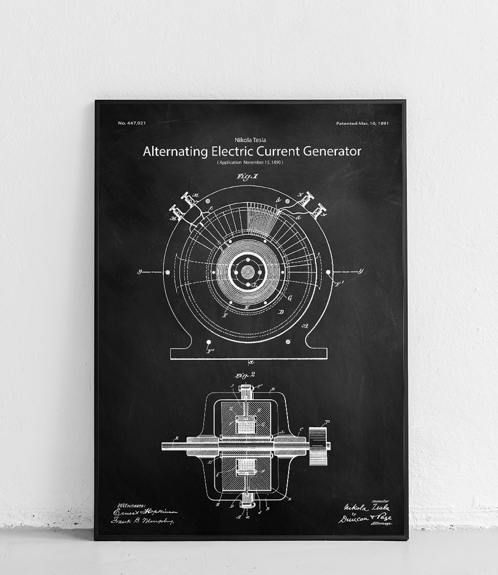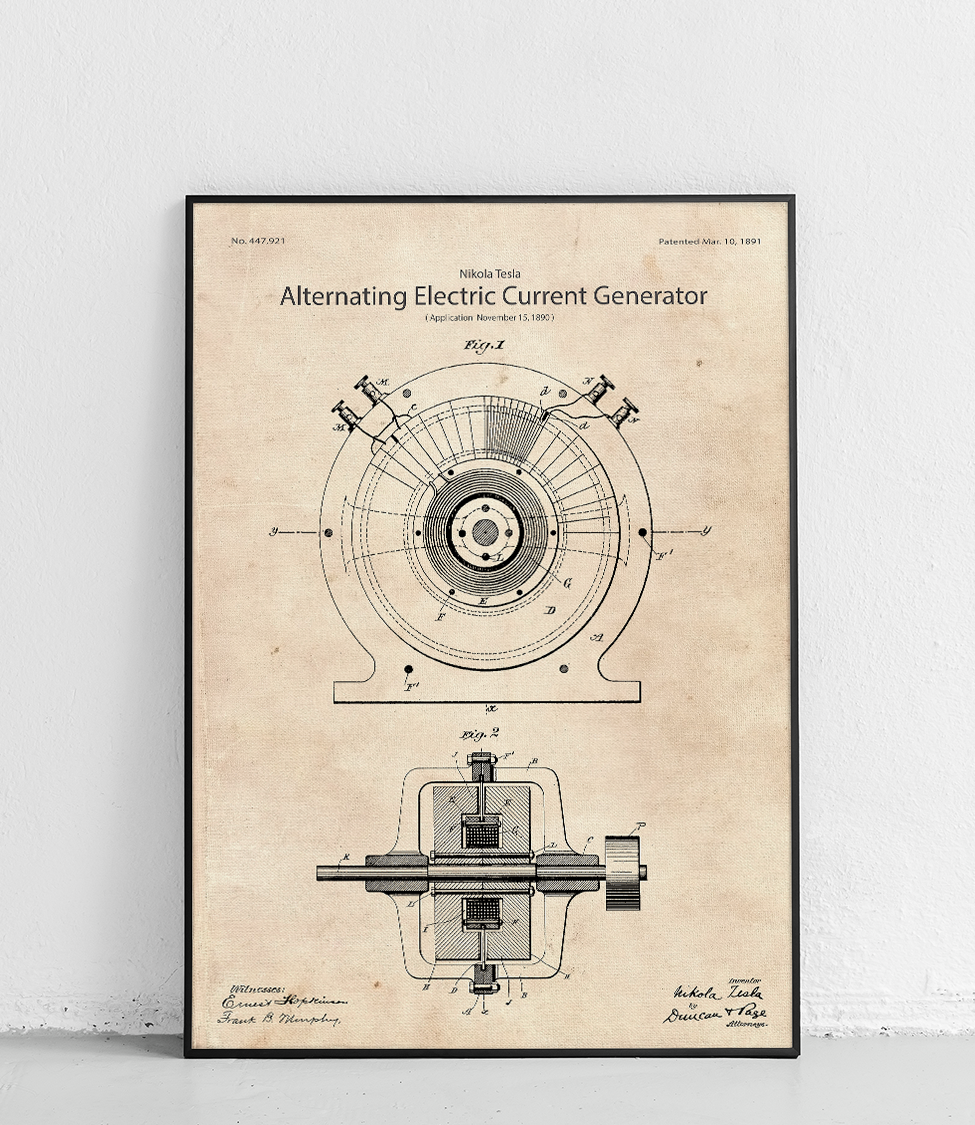 Plakat z reprodukcją patentu przedstawiającego generator prądu przemiennego autorstwa Nikola Tesli.