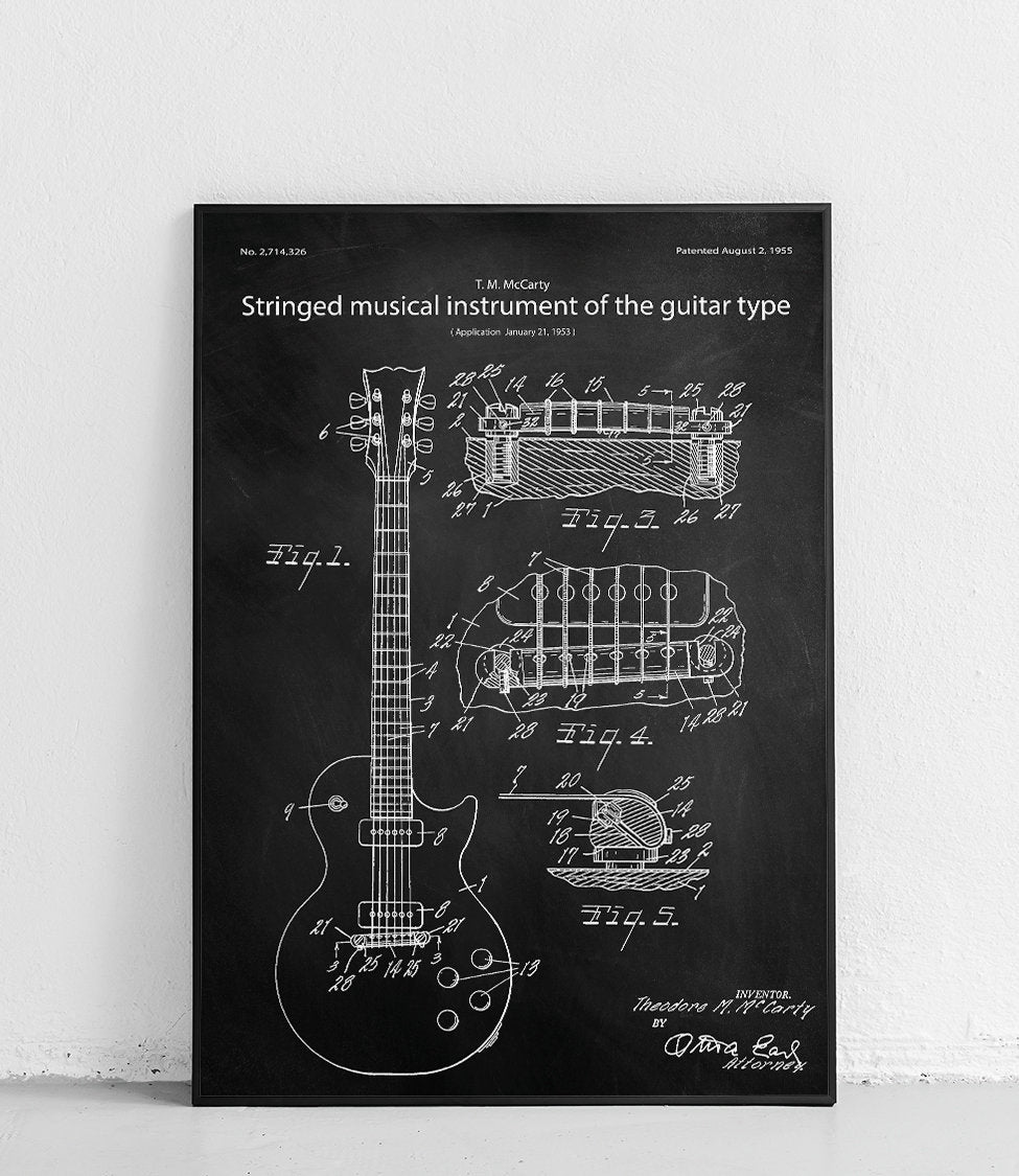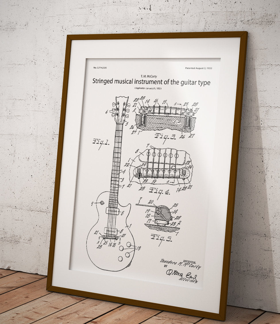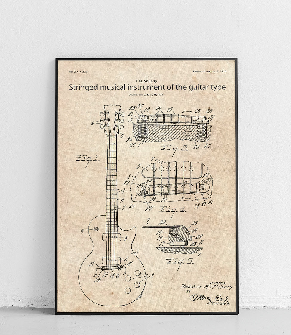 Plakat gitara to innowacyjny rysunek techniczny gitary elektrycznej Gibson Les Paul opatentowanej w 1955 roku przez Urząd Patentów i Znaków Towarowych Stanów Zjednoczonych.