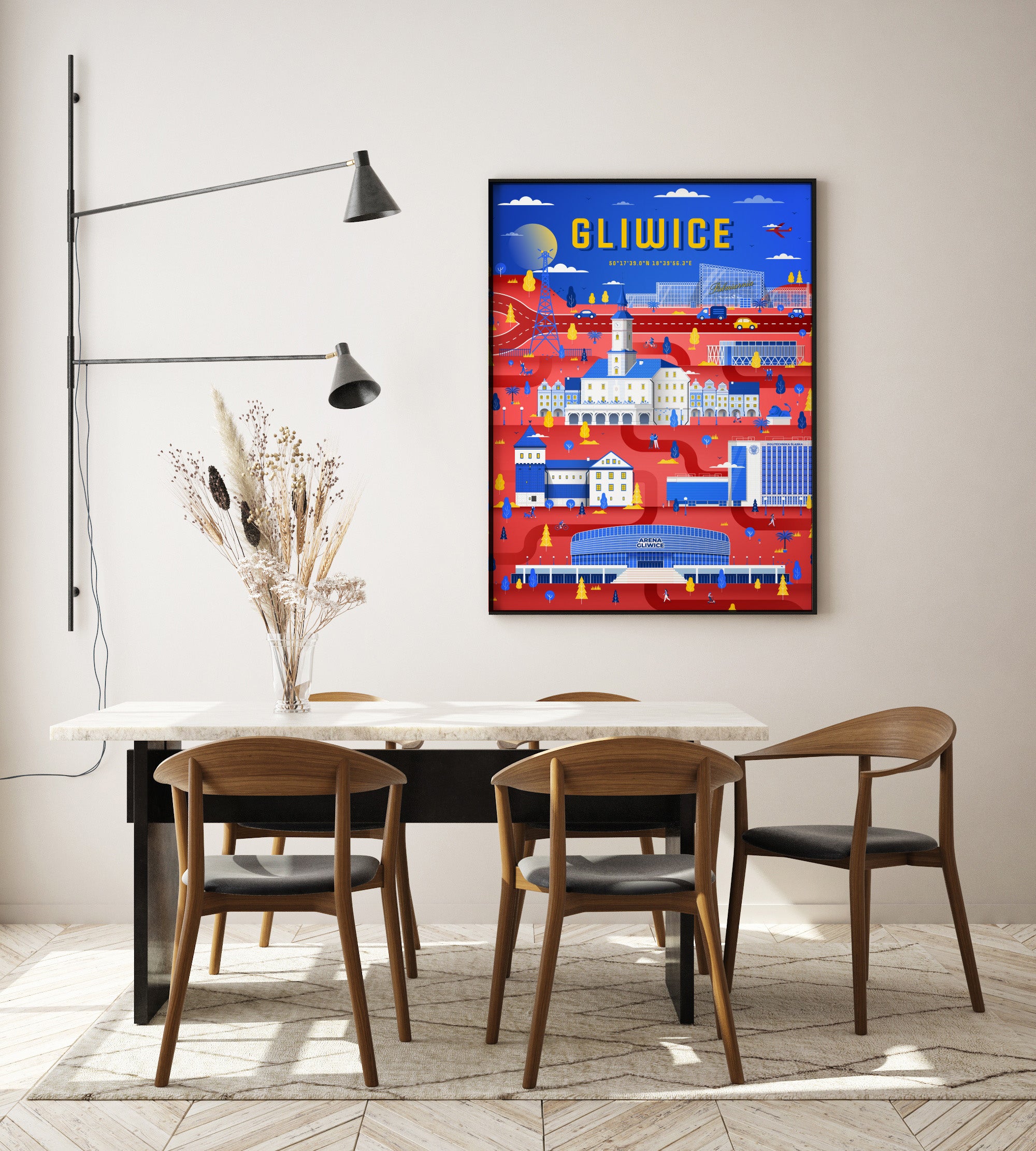 Plakat przedstawia symbole Gliwic, w tym: Ratusz, Radiostacja Gliwicka, Arena Gliwice, Palmiarnia Miejska, Zamek Piastowski, Politechnika Śląska.