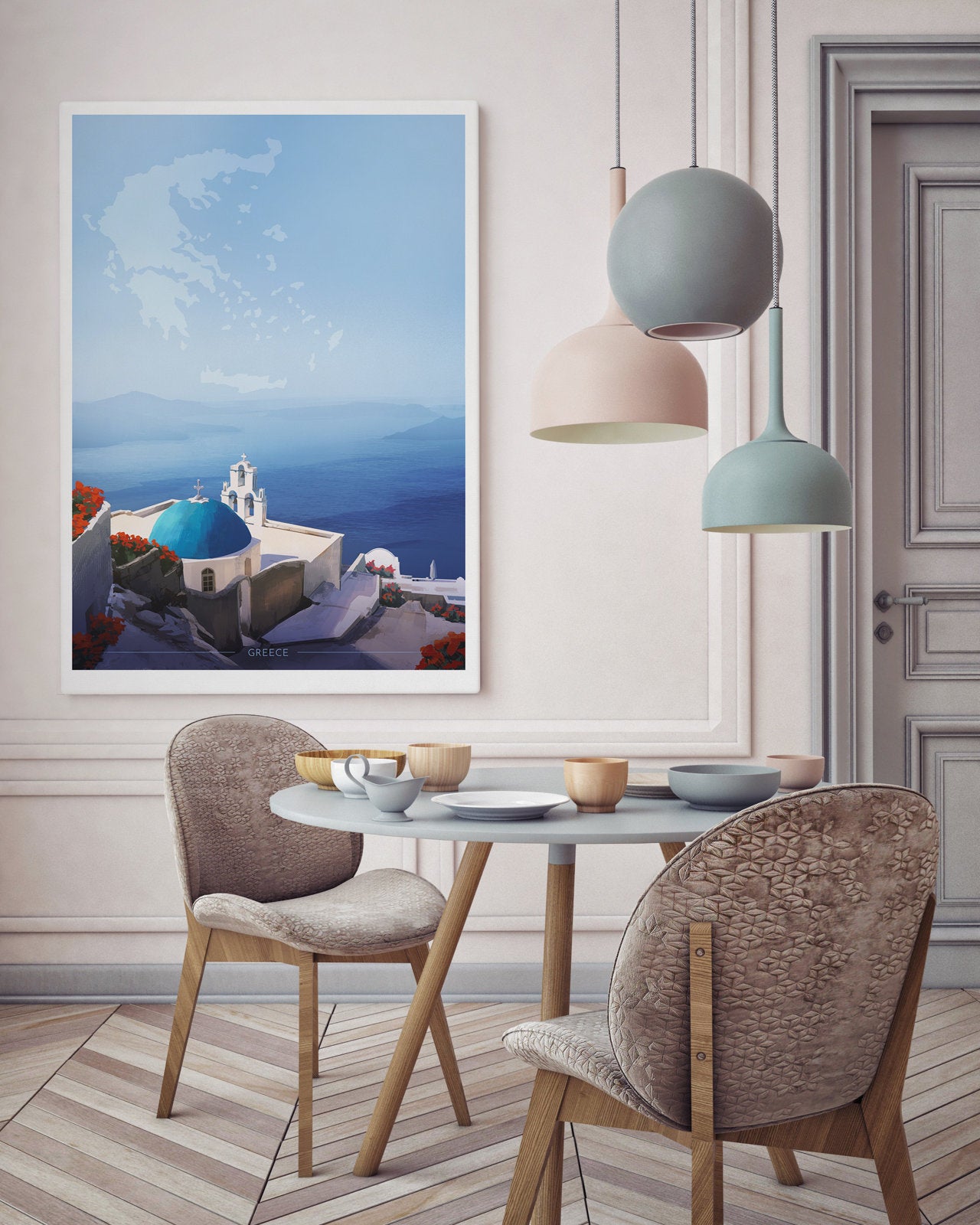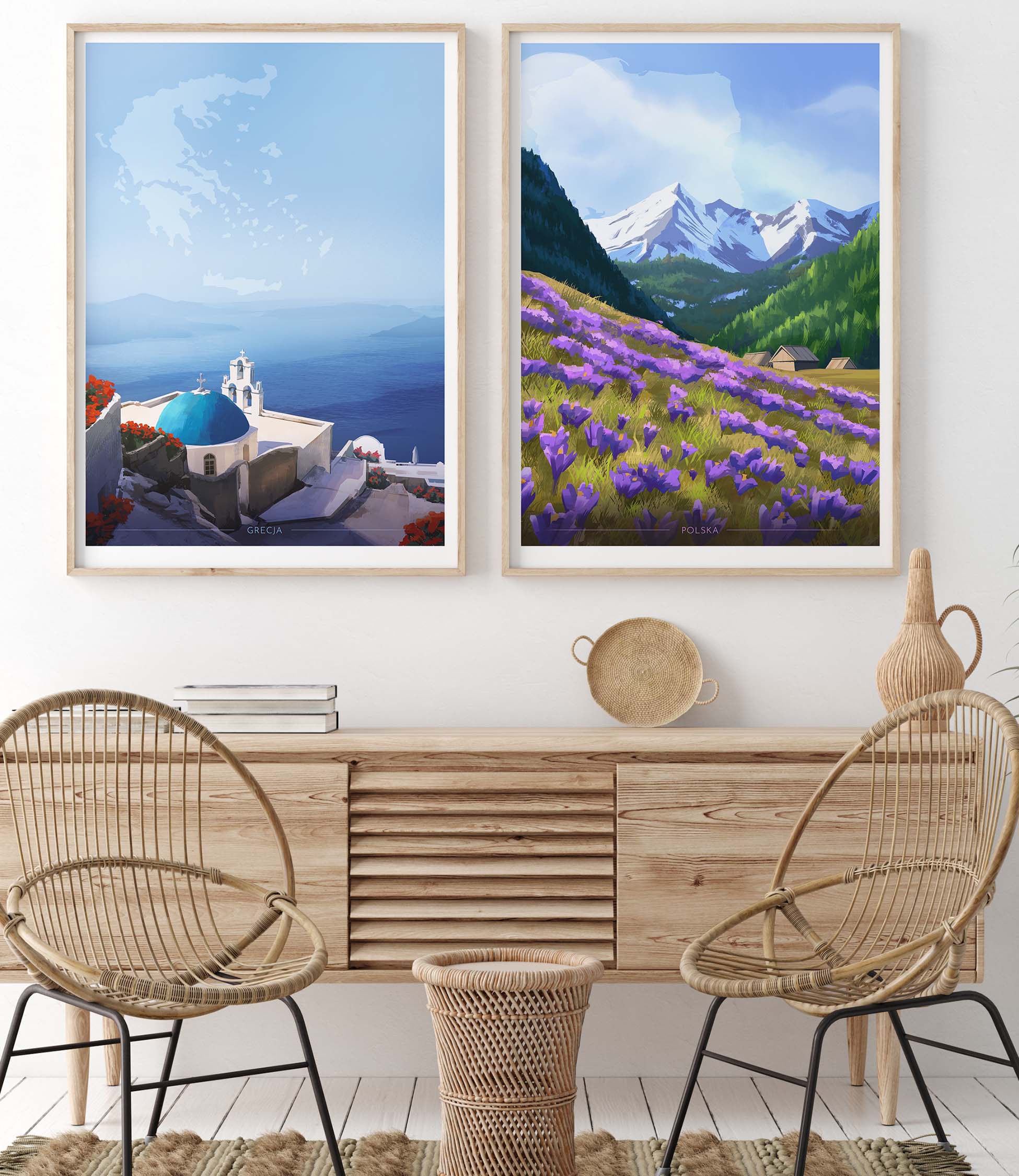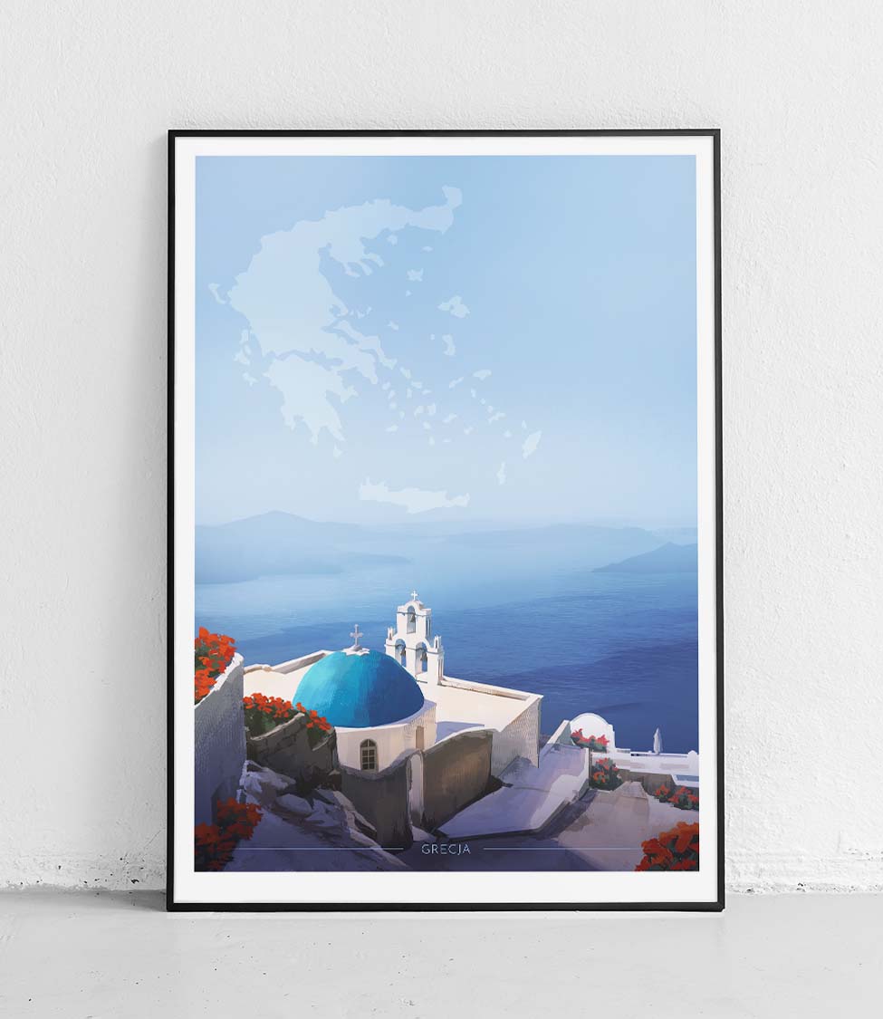 Ten plakat przedstawia region szczególny, Grecję. Plakat Grecja ukazuje przepiękny widok na malowniczo położoną wulkaniczną wyspę Santorini na Morzu Egejskim położona w południowej części Cyklad. Za symbol na plakat wybraliśmy miasto Fira (Thira) z widokiem na greckokatolicki kościół oficjalnie znany pod nazwą jako Kościół Zaśnięcia NMP (grecki: Τρεις καμπάνες των Φηρών). Kościół słynie z trzech dzwonów, niebieskiej kopuły i malowniczych widoków. Znajduje się bezpośrednio nad klifami, które dominują w zachodniej części Santorini.