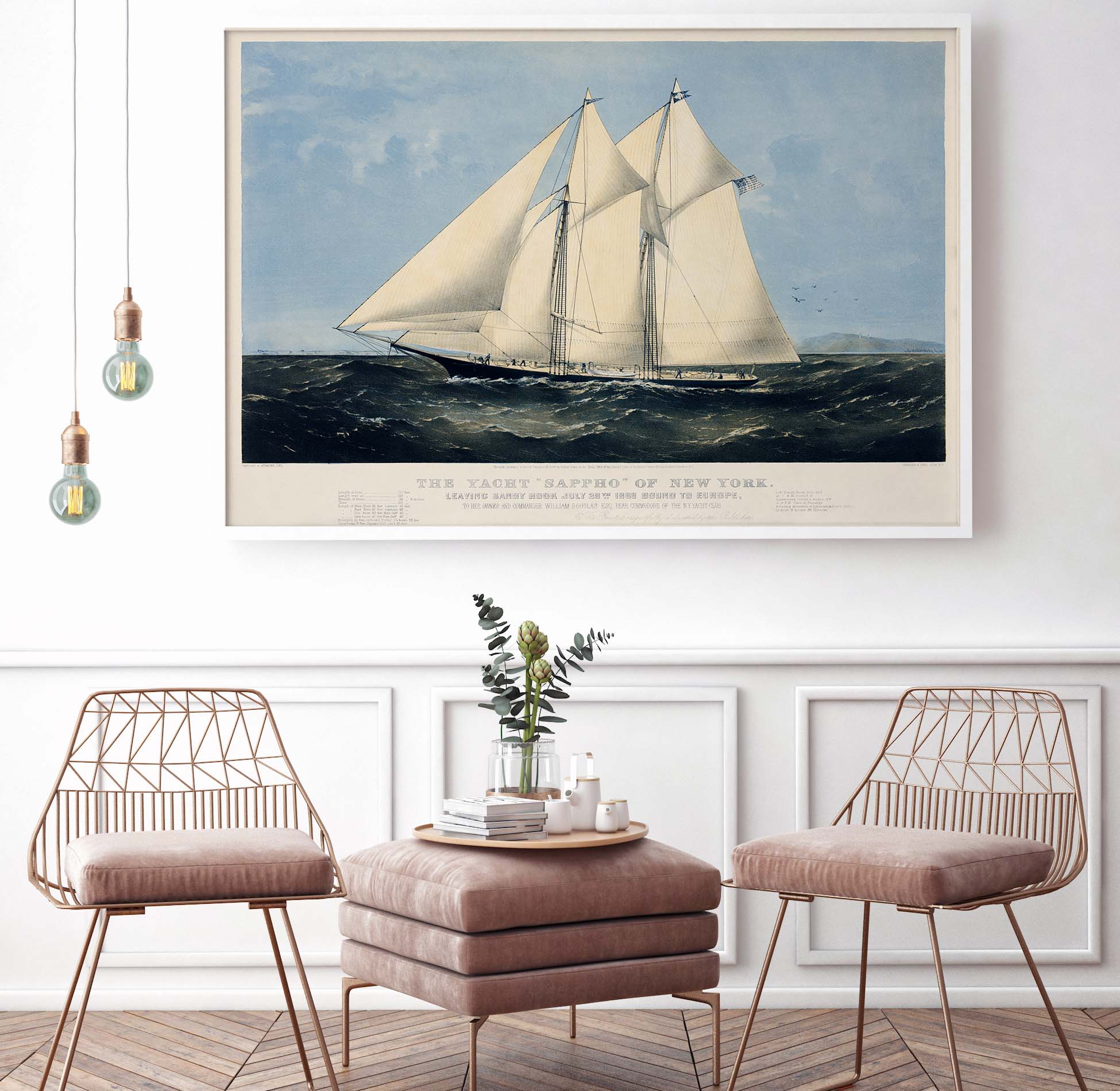 Plakat przedstawiający piękny jacht Sappho, idealny dla miłośników żeglarstwa i podróży.