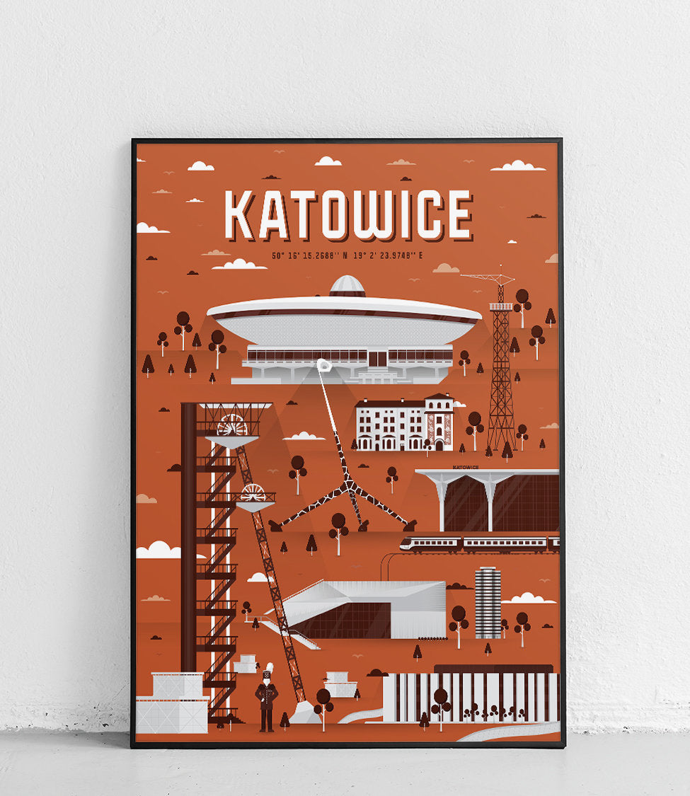 to bardzo nowoczesny i pełen głębi poster z naszej serii Miasta Polski. Jego autorem jest znany wrocławski artysta, Robert Kostrzewa.Plakat z Katowicami