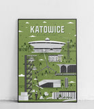 plakacie Katowice dopełniają słynne wieżowce - kukurydze, czyli kompleks najwyższych budynków mieszkalnych miasta, które liczą aż 26 kondygnacji.