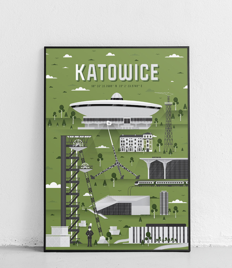 Na katowickim plakacie nie zabrakło także nowoczesnego Dworca PKP Katowice, zabytkowego gmachu poczty, wieży spadochronowej, czy sali koncertowej NOSPR.