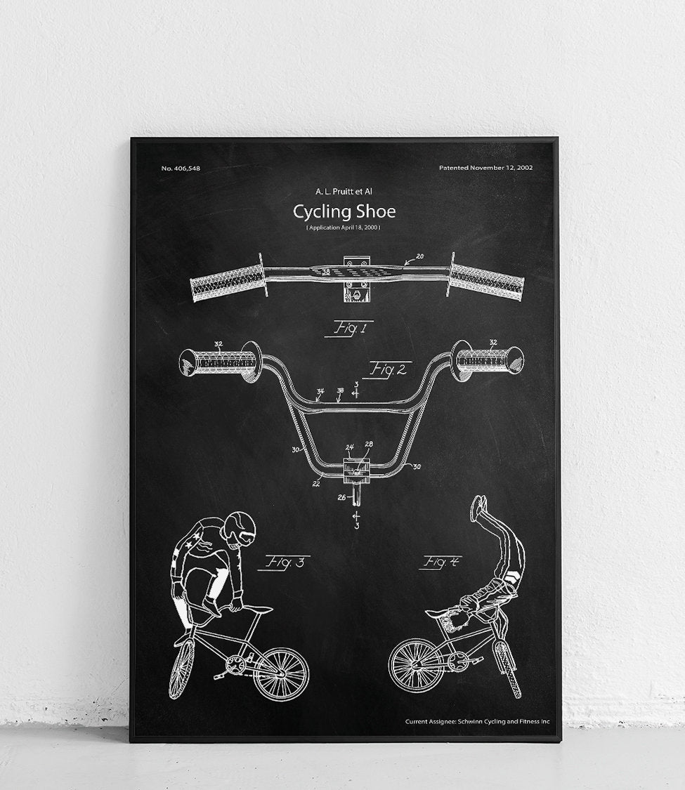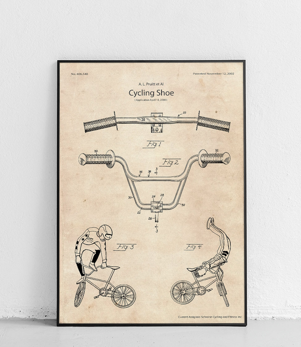 Plakat z reprodukcją patentu przedstawiającego płaską poprzeczkę do kierownicy roweru freestyle, autorstwa Mark'a Greco.