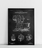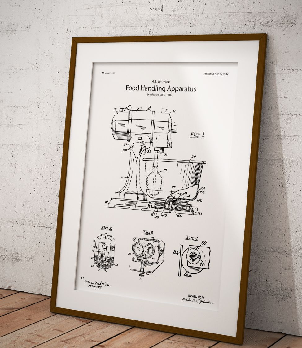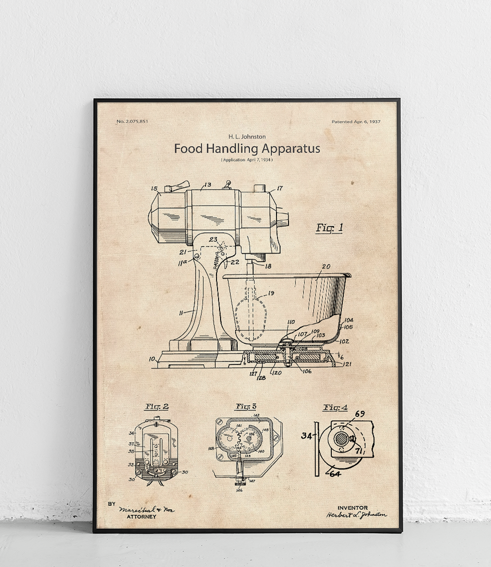 Plakat z reprodukcją patentu przedstawiającego robot kuchenny autorstwa Herberta L. Johnston.