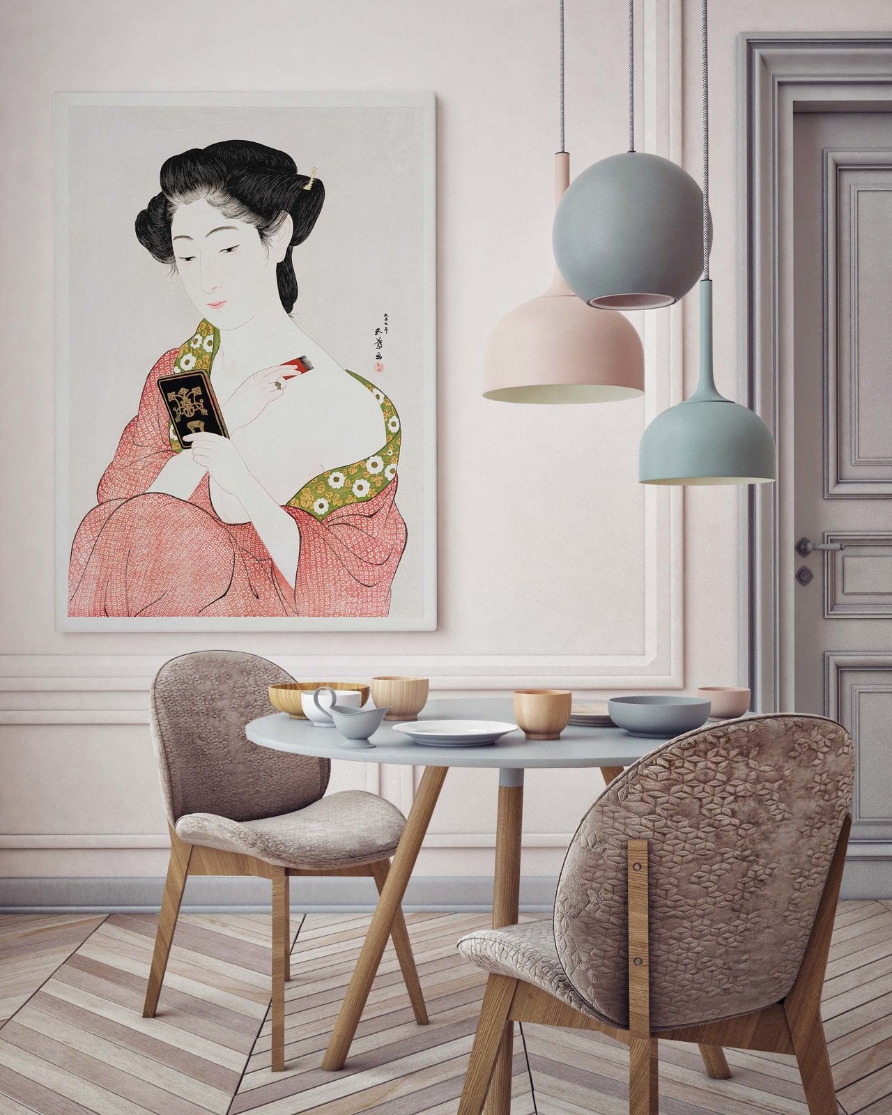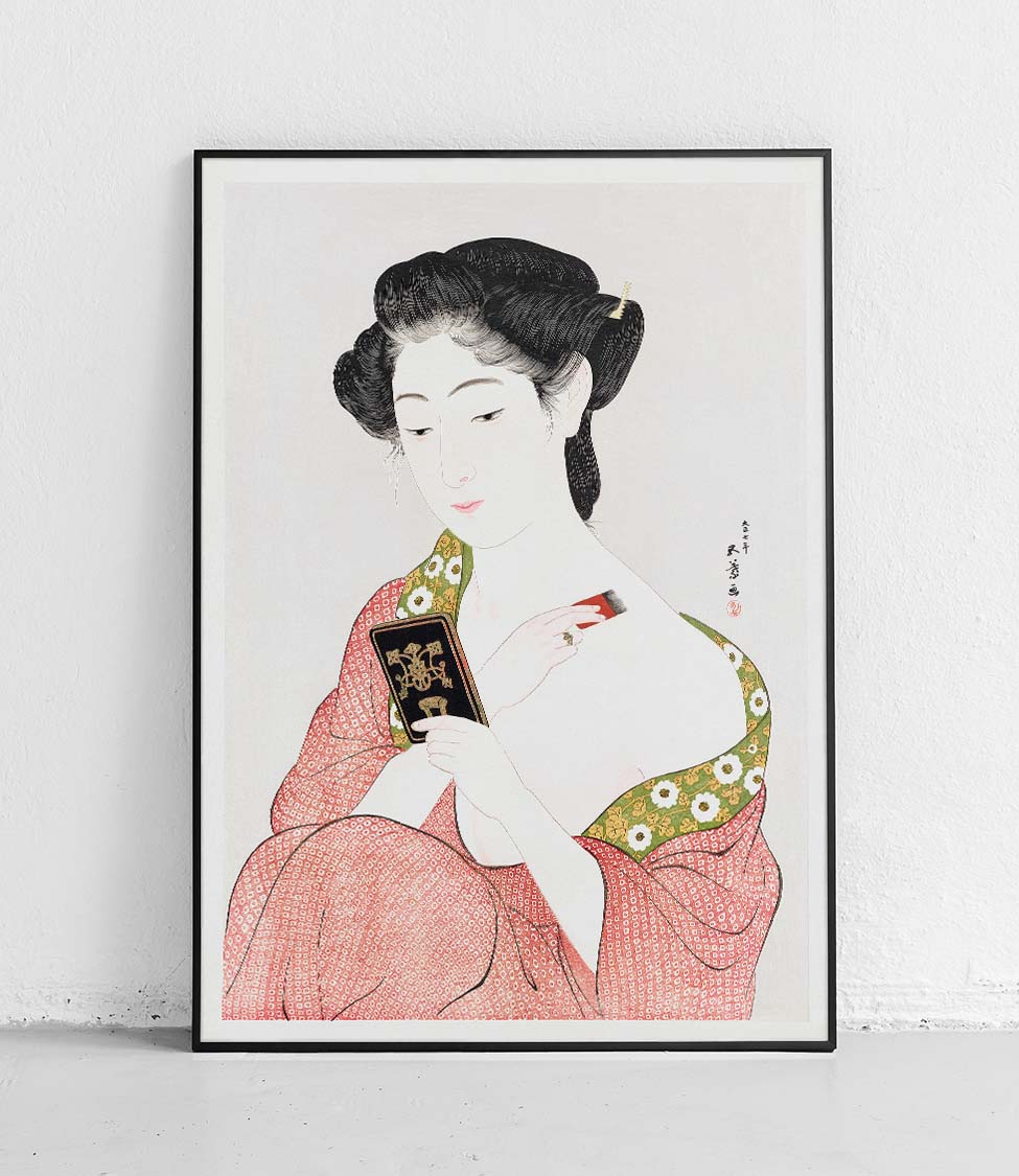 Ilustracja "Kobieta nakładająca puder" wykonana przez Goyō Hashiguchi, japońskiego artystę. Stał na czele ruchu shin-hanga, odrodzenia ukiyo-e, zaprojektował czternaście odbitek drzeworytniczych, które są uważane za arcydzieła tego gatunku.