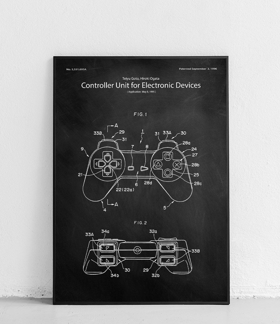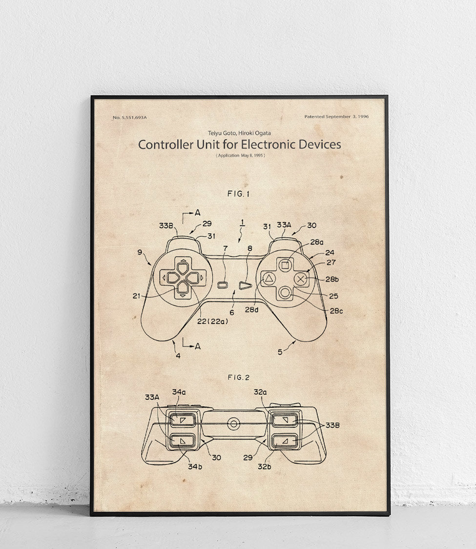 Plakat z reprodukcją patentu pada do konsoli PlayStation autorstwa Teiyu Goto, który w Sony Interactive Entertainment Inc. odpowiadał za stworzenie projektu konsoli oraz podstawowych akcesoriów, takich jak kontroler oraz karta pamięci.