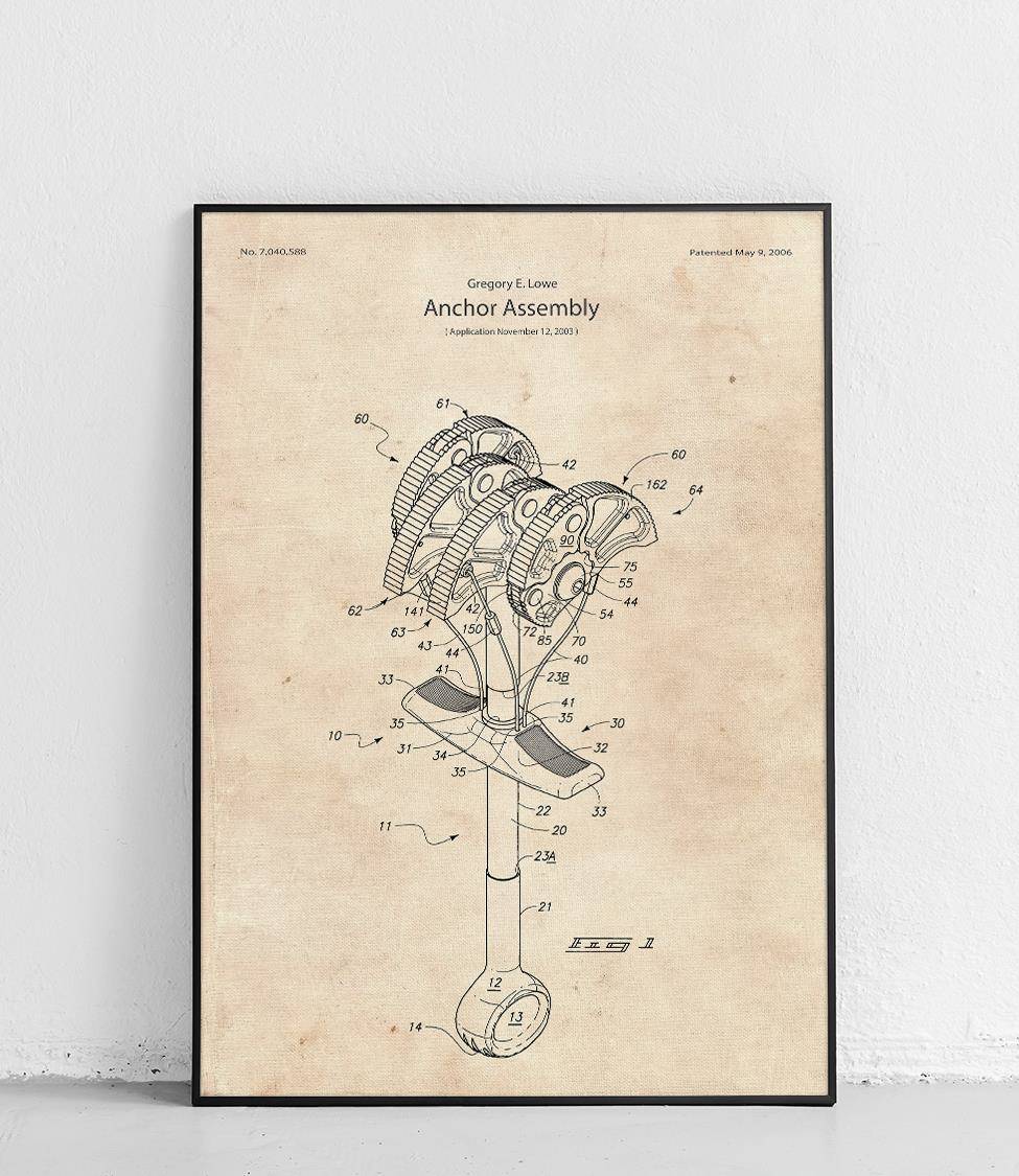 Plakat z reprodukcją patentu przedstawiającego kości wspinaczkowe autorstwa Gregory E. Lowe.