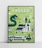 posteru Kraków jest znajdujący się na krakowskim rynku słynny Kościół Mariacki. To z jego wieży codziennie o godz. 12 na krakowskim Rynku Głównym słychać urywający się hejnał.Po lewej stronie zabytkowego kościoła na plakacie Kraków została przedstawiona ziejąca ogniem legendarna rzeźba Smoka Wawelskiego. Sąsiaduje ona z nadwiślańskimi bulwarami oraz Wawelem.
