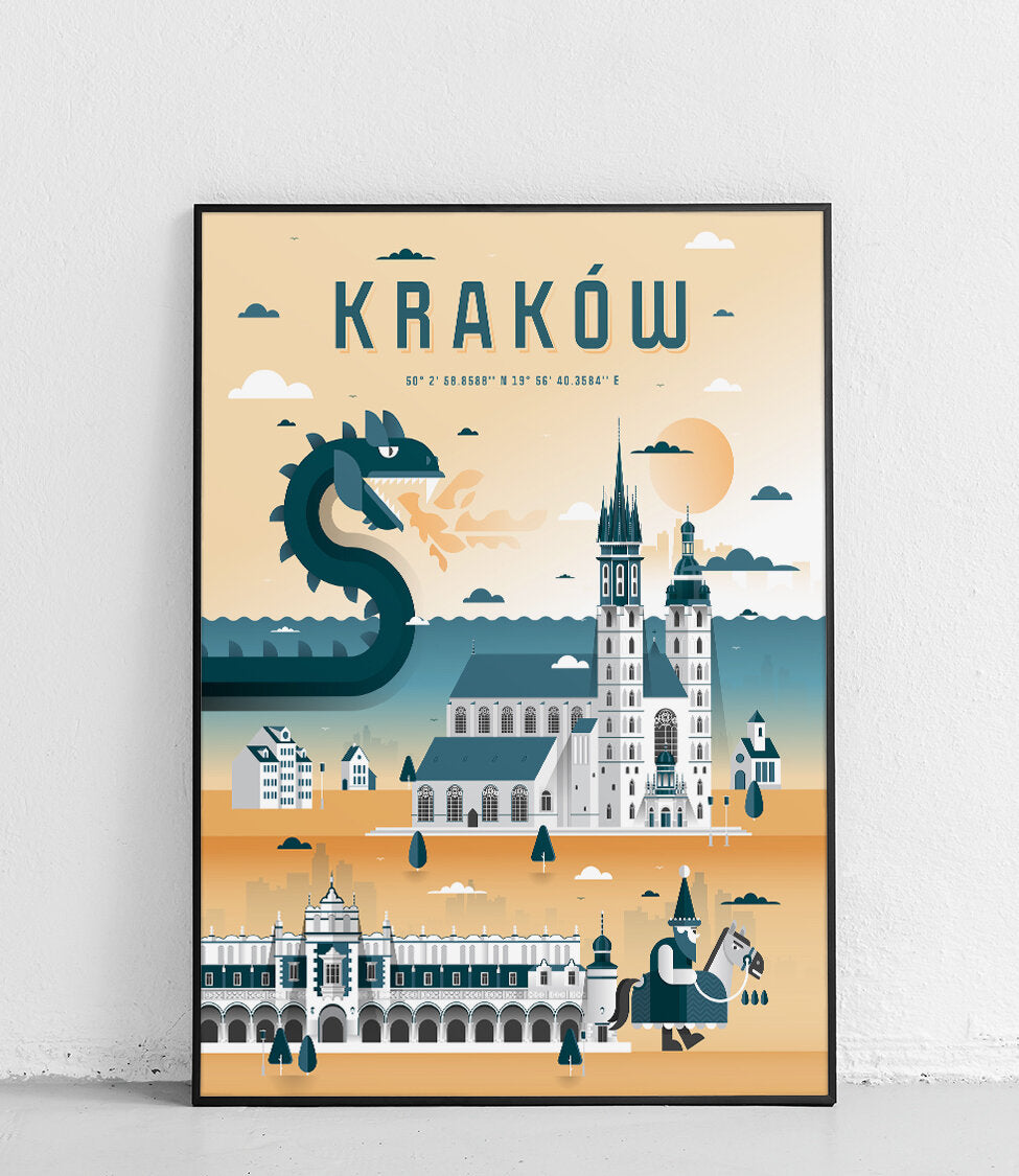 posteru Kraków jest znajdujący się na krakowskim rynku słynny Kościół Mariacki. To z jego wieży codziennie o godz. 12 na krakowskim Rynku Głównym słychać urywający się hejnał.Po lewej stronie zabytkowego kościoła na plakacie Kraków została przedstawiona ziejąca ogniem legendarna rzeźba Smoka Wawelskiego. Sąsiaduje ona z nadwiślańskimi bulwarami oraz Wawelem.