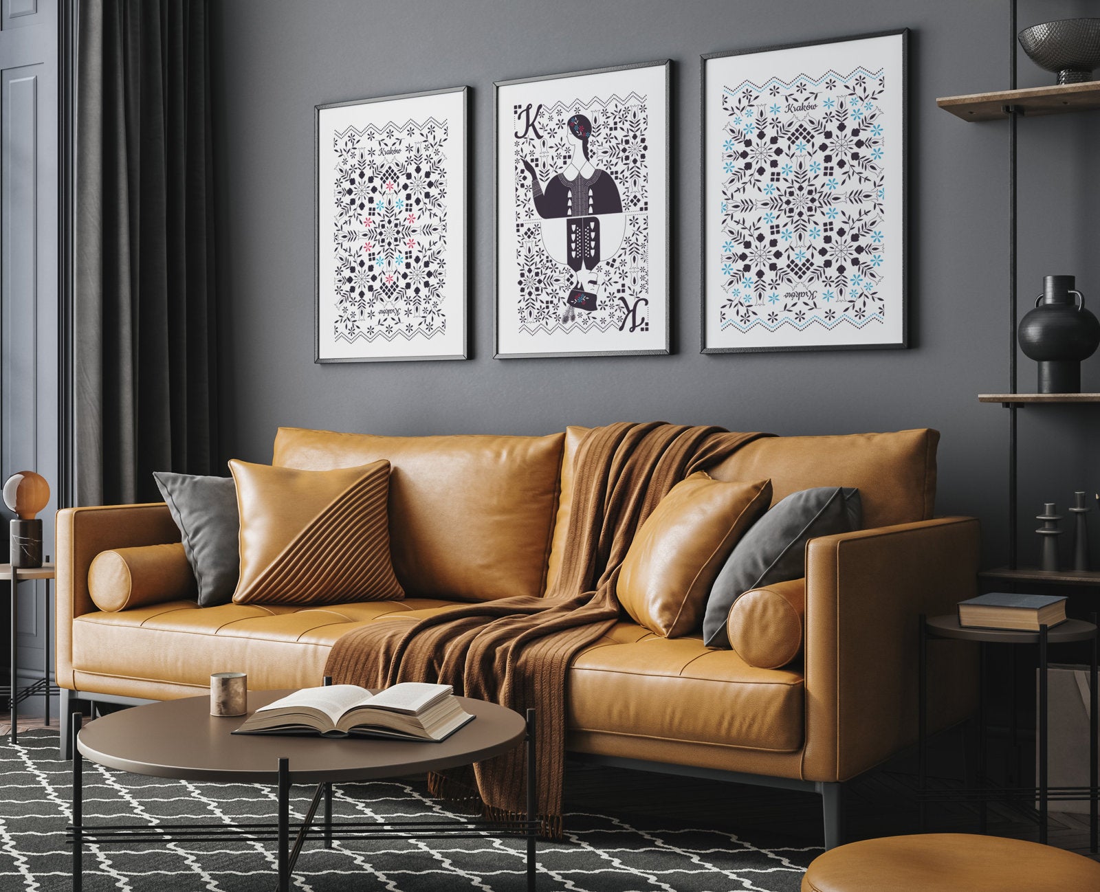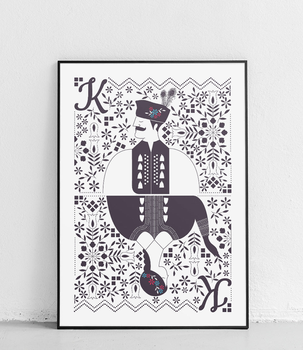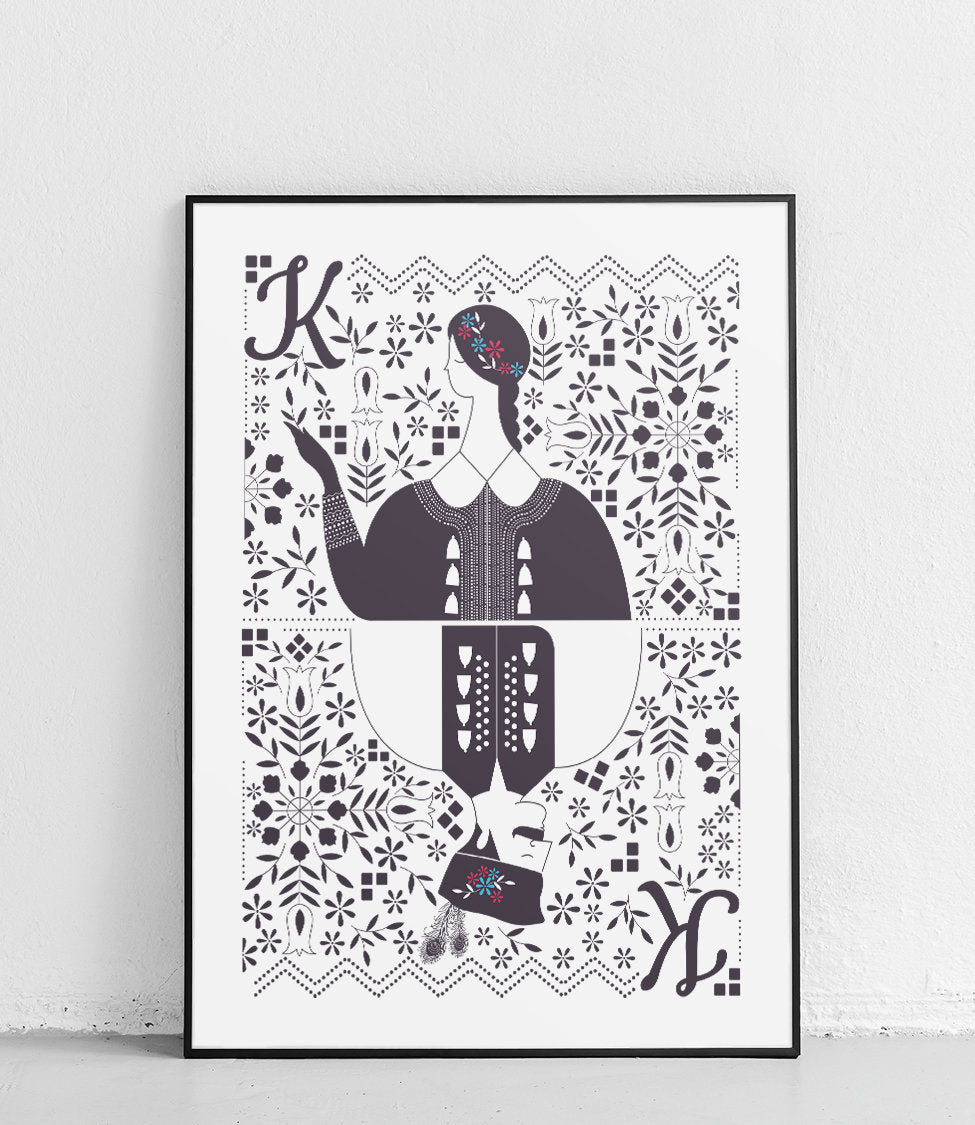 Plakat z serii “Stroje ludowe” przedstawia polskie stroje ludowe z różnych grup etnograficznych. Chcieliśmy pokazać część naszej rodzimej tradycji, polskiego folkloru w inny, przewrotny i nowoczesny sposób. Dlatego też zdecydowaliśmy się na pokazanie ubioru ludowego w formie talii kart. Jedna karta przypada na kobietę i mężczyznę w tradycyjnym stroju z danej grupy etnograficznej, druga na tył karty, która prezentuje główne motywy z zakresu wzornictwa z danego regionu.
