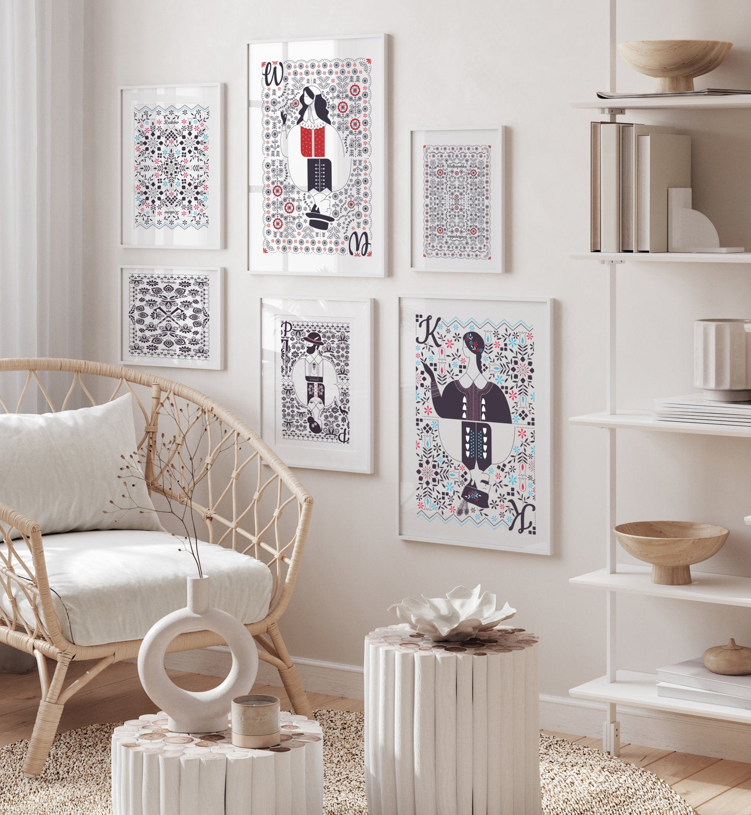 Plakat z serii “Stroje ludowe” przedstawia polskie stroje ludowe z różnych grup etnograficznych. Chcieliśmy pokazać część naszej rodzimej tradycji, polskiego folkloru w inny, przewrotny i nowoczesny sposób. Dlatego też zdecydowaliśmy się na pokazanie ubioru ludowego w formie talii kart. Jedna karta przypada na kobietę i mężczyznę w tradycyjnym stroju z danej grupy etnograficznej, druga na tył karty, która prezentuje główne motywy z zakresu wzornictwa z danego regionu.
