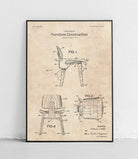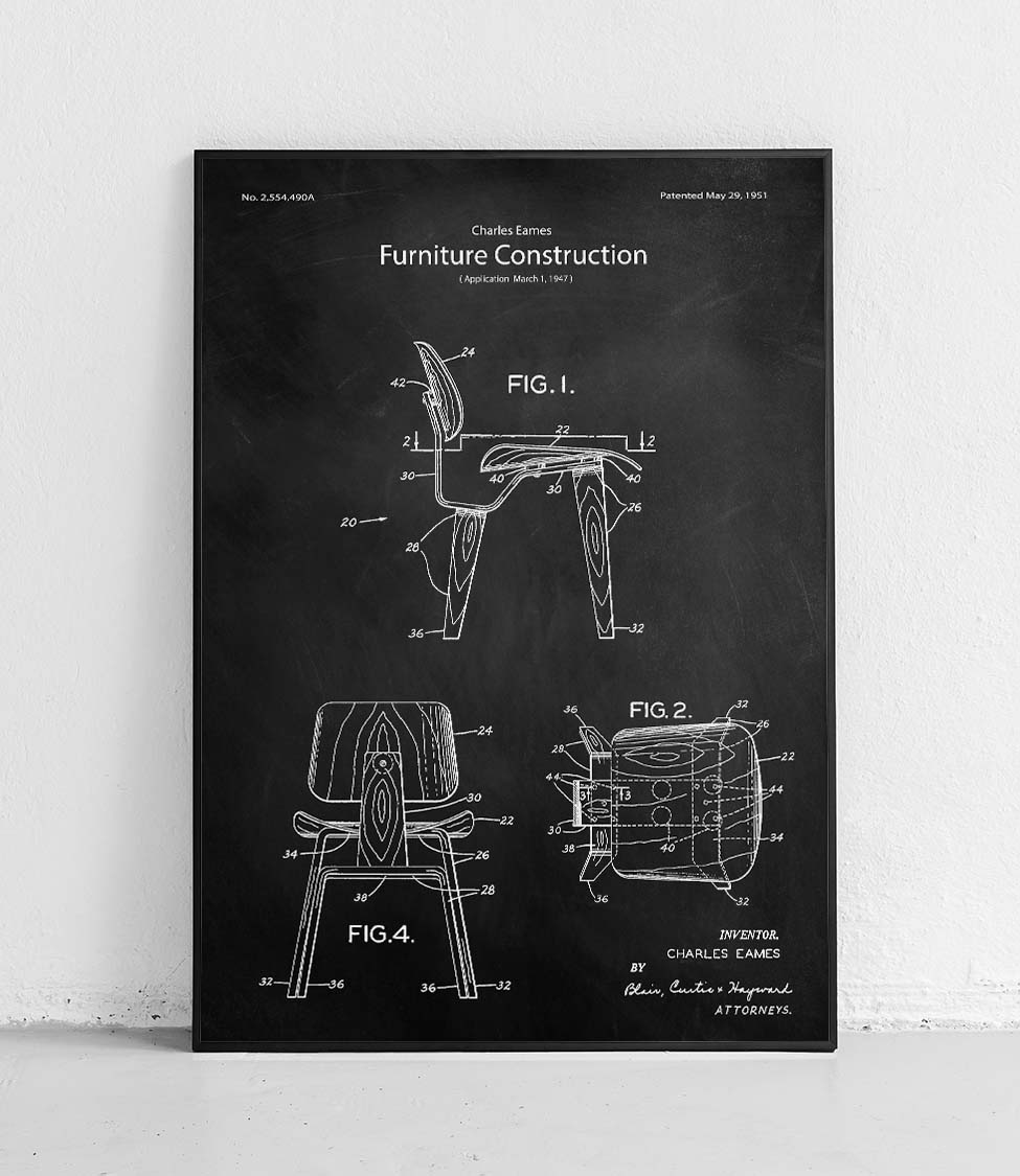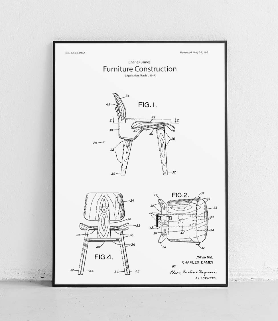 Plakat z reprodukcją patentu przedstawiającego krzesło Eames LCW, autorstwa Charles Eames.
