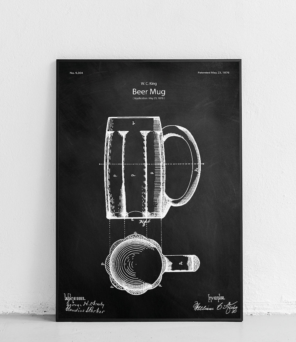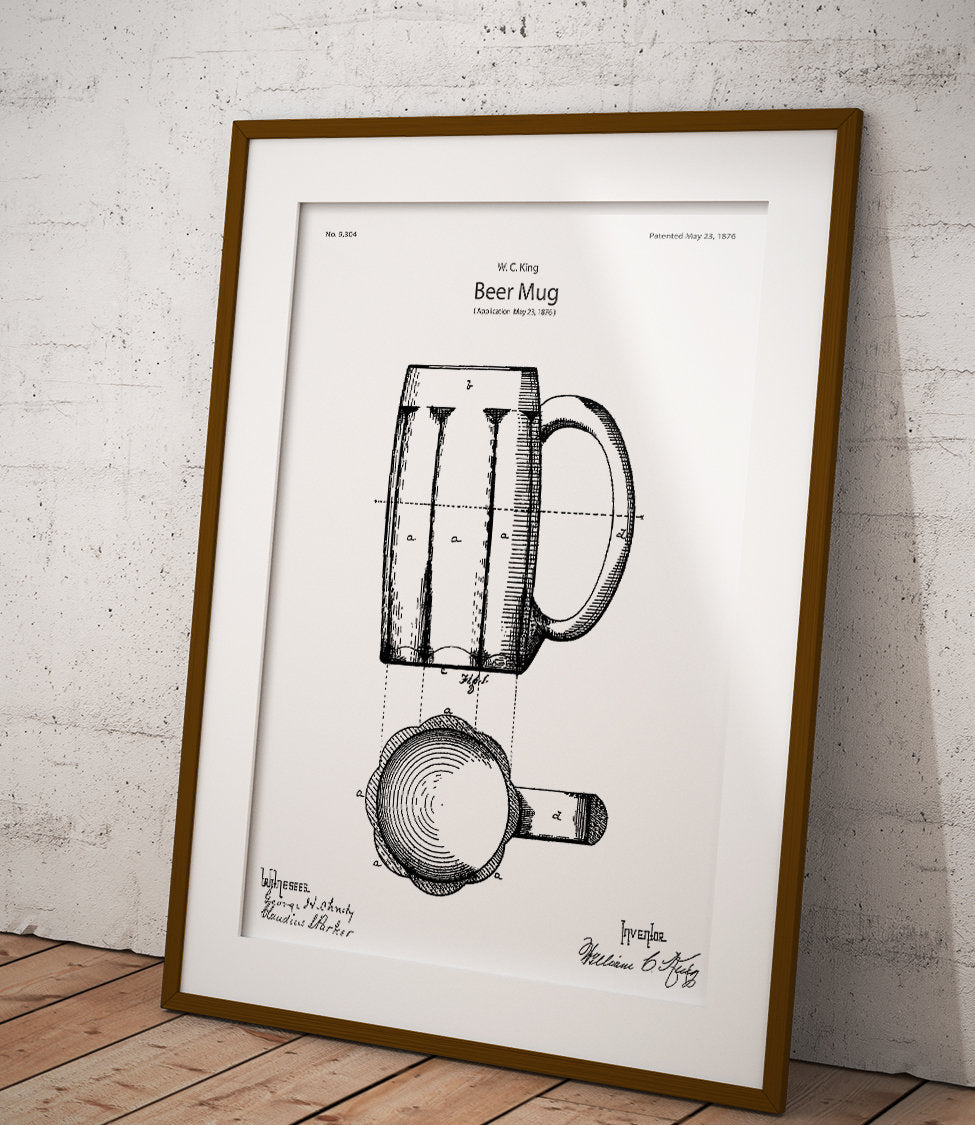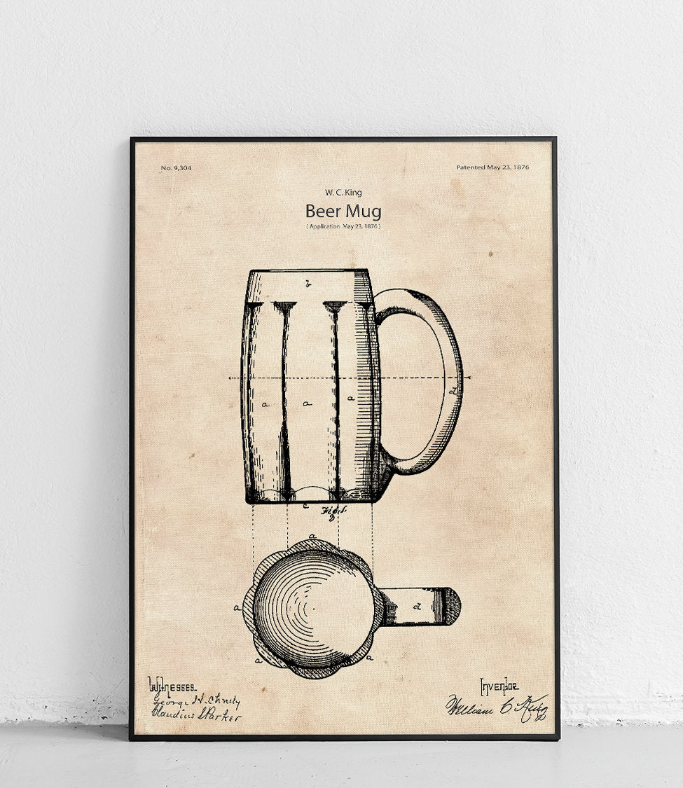 Plakat z reprodukcją patentu przedstawiającego kufel do piwa, autorstwa William'a C. King.
