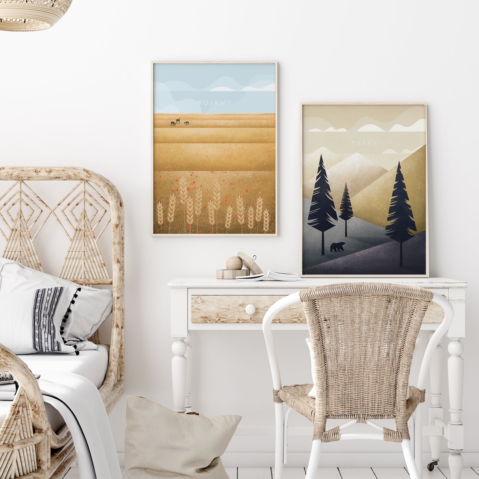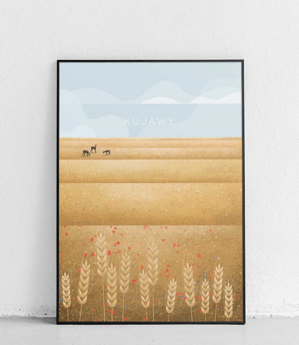 Plakat KUJAWY to przede wszystkim lekki, letni obraz przedstawiający wyrastające na polach zboża. Pierwszy plan Kujaw ukazuje kłosy pszenicy oraz przebijające przez nie gdzieniegdzie czerwone maki. W oddali znajdują się biegające w polu trzy sarny symbolizujące dziecięcą troskę, łagodność oraz zrozumienie. Plakat na ścianę z widokiem Kujaw wywołuje przyjemne i pozytywne emocje, nawiązujące do dzieciństwa spędzonego w rodzinnych stronach na wsi. To na nowo zarysowana mapa tego regionu. KUJAWY to poster nowoczesny polskiej turystyki charakteryzujący żyzne gleby oraz wszechobecny dostatek. Jest tym samym doskonałą formą talizmanu, który warto umieścić w swoim domu.