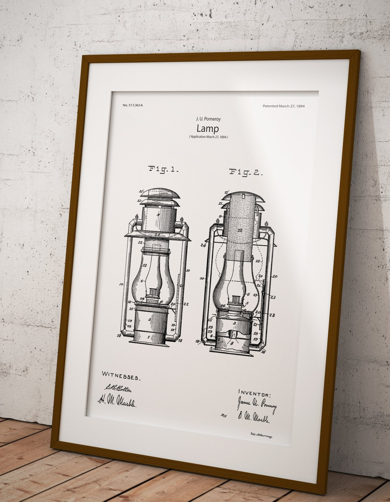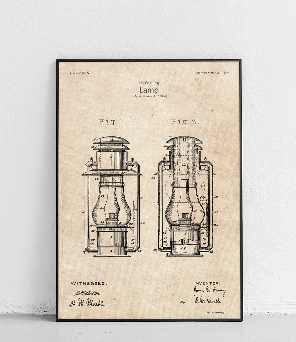 Plakat z reprodukcją patentu lampy naftowej autorstwa James'a U. Pomeroy.
