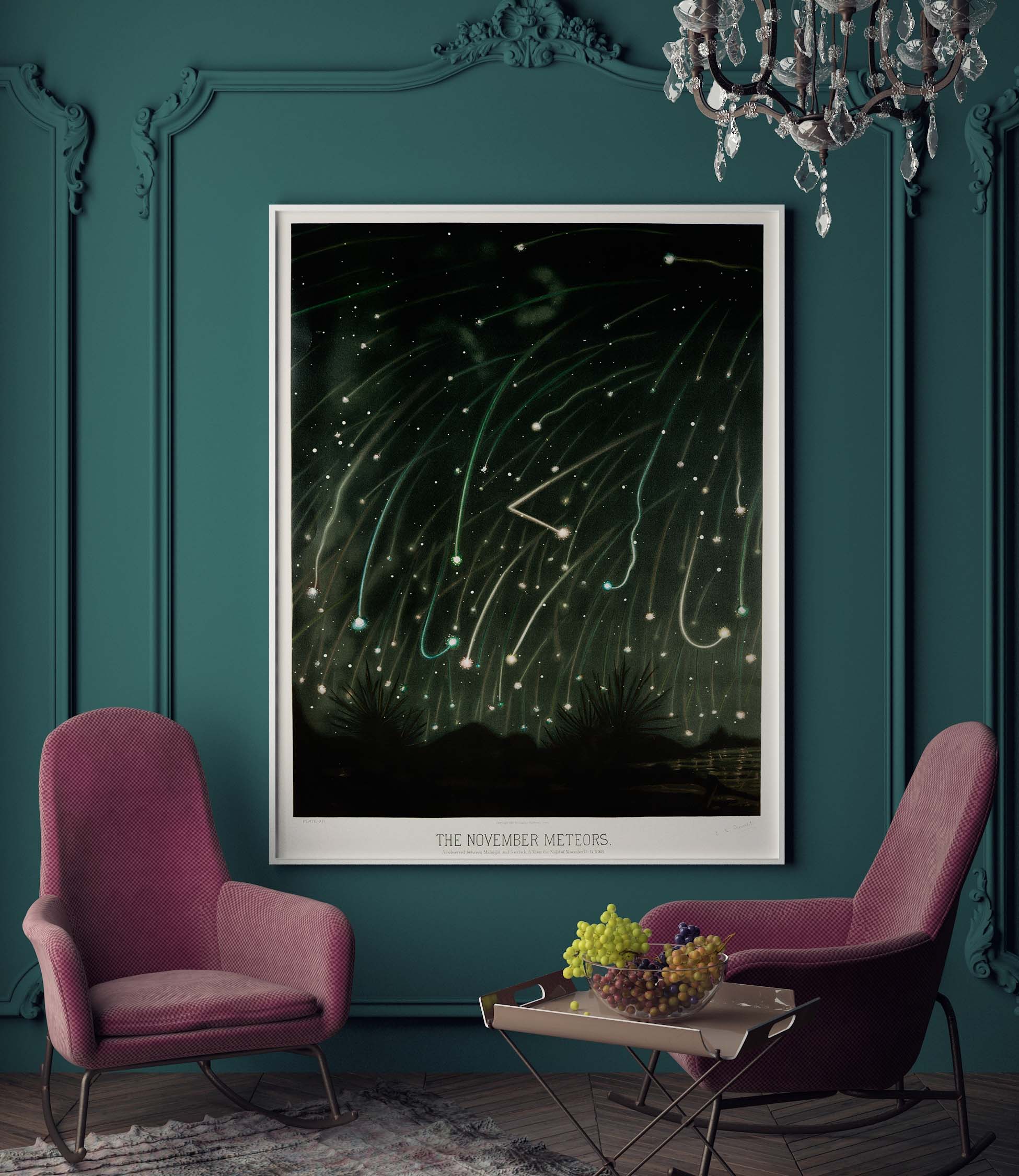 Plakaty z serii “Astronomia” przedstawia "Listopadowe meteory" z rysunków astronomicznych Trouvelota autorstwa Étienne Léopolda Trouvelota (1827-1895), francuskiego artysty, astronoma i entomologa.